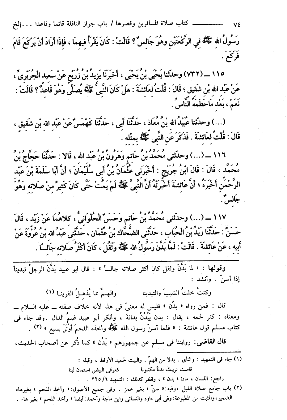 116 - (...) وحدَّثنى مُحَمَّدُ بْنُ حَاتِمٍ وَهَارُونُ بْنُ عَبْدِ اللهِ، قَالا: حَدَّثَنَا حَجَّاجُ بْنُ مُحَمَّدٍ، قَالَ: قَالَ ابْنُ جُرَيْجٍ: أَخْبَرَنِى عُثْمَانُ بْنُ أَبِى سُلَيْمَانَ؛ أَنَّ أَبَا سَلَمَةَ بْن عَبْدِ الرَّحْمَنِ أَخْبَرَهُ؛ أَنَّ عَائِشَةَ أَخْبَرَتْهُ أَنَّ النَّبِىَّ صَلَّى اللهُ عَلَيْهِ وَسَلَّمَ لَمْ يَمُتْ حَتَّى كَانَ كَثِيرٌ مِنْ صَلاتِهِ وَهُوَ جَالِسٌ.