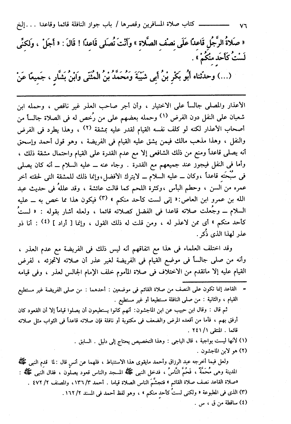 ثم قال: وقال ابن حبيب عن ابن الماجشون: أنهم كانوا يستطيعون أن يصلوا قياماً إلا أن القعود كان أرفق بهم، فأما من أقعده المرض والضعف فى مكتوبة أو نافلة فإن صلاته قاعداً فى الثواب مثل صلاته قائماً. المنتقى 1/ 241.