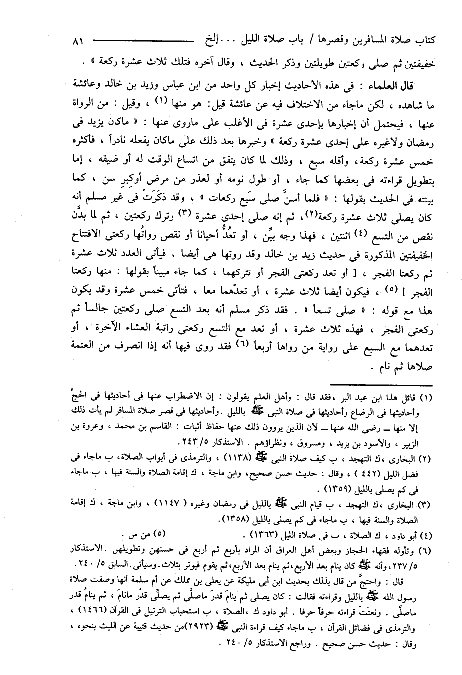 (¬2) البخارى، ك التهجد، ب كيف صلاة النبى صَلَّى اللهُ عَلَيْهِ وَسَلَّمَ (1138)، والترمذى فى أبواب الصلاة، ب ما جاء فى فضل الليل (442)، وقال: حديث حسن صحيح، وابن ماجة، ك إقامة الصلاة والسنة فيها، ب ما جاء فى كم يصلى بالليل (1359).