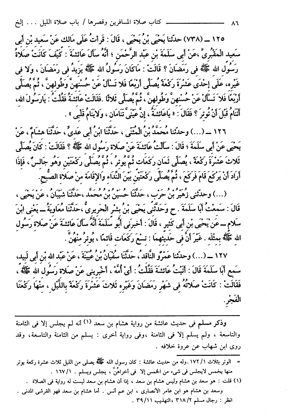 126 - (...) وحدّثنا مُحَمَّدُ بْنُ الْمُثَنَّى، حَدَّثَنَا ابْنُ أَبِى عَدِىٍّ، حَدَّثَنَا هِشَامٌ، عَنْ يَحْيَى عَنْ أَبِى سَلَمَةَ؛ قَالَ: سَأَلْتُ عَائِشَةَ عَنْ صَلاةِ رَسُولِ اللهِ صَلَّى اللهُ عَلَيْهِ وَسَلَّمَ؟ فَقَالَتْ: كَانَ يُصَلِّى ثَلاثَ عَشْرةَ رَكْعَةً، يُصَلِّى ثَمَانِ رَكَعَاتٍ ثُمَّ يُوتِرُ، ثُمَّ يُصَلِّى رَكْعَتَيْنِ وَهُو جَالِسٌ، فَإِذَا أَرَادَ أَنْ يَرْكَعَ قَامَ فَرَكَعَ، ثُمَّ يُصَلِّى رَكْعَتَيْنِ بَيْنَ النِّدَاءِ وَالإِقَامَة مِنْ صَلاةِ الصُّبحِ.