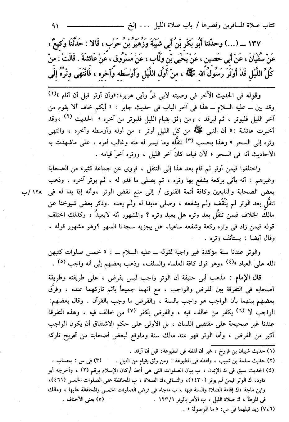 قال الإمام: مذهب أبى حنيفة أن الوتر واجب ليس بفرض، على طريقته وطريقة أصحابه فى التفرقة بين الفرض والواجب، مع أنهما جميعاً يأثم تاركهما عنده، وفرَّق بعضهم بينهما بأن الواجب هو واجب بالسنة، والفرض ما وجب بالقرآن. وقال بعضهم: الواجب لا (¬6) يكفر من خالف فيه، والفرض يكفر (¬7) من خالف فيه، وهذه التفرقة عندنا غير صحيحة على مقتضى اللسان، بل الأولى على حكم الاشتقاق أن يكون الواجب أكبر من الفرض، وأما الوتر فهو عند مالك سنة وما وقع لبعض أصحابنا من تجريح تاركه