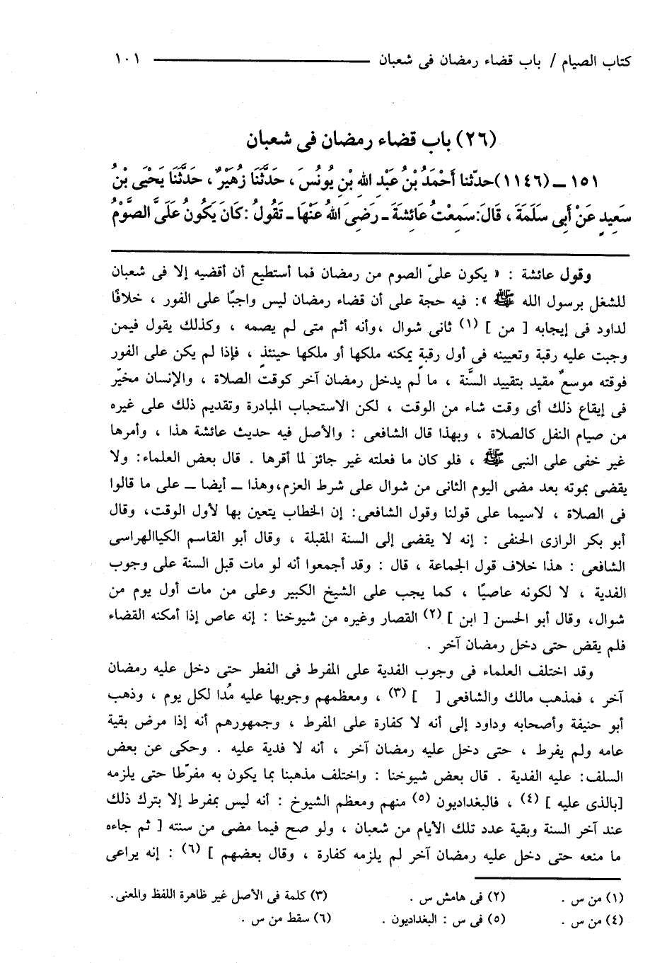 151 - (1146) حدّثنا أَحْمَدُ بْنُ عَبْدِ اللهِ بْنِ يُونُسَ، حَدَّثَنَا زُهَيْرٌ، حَدَّثَنَا يَحْيَى بْنُ سَعِيدٍ عَنْ أَبِى سَلَمَةَ، قَالَ: سَمِعْتُ عَائِشَةَ - رَضِىَ اللهُ عَنْهَا - تَقُولُ: كَانَ يَكُونُ عَلَىَّ الصَّوْمُ