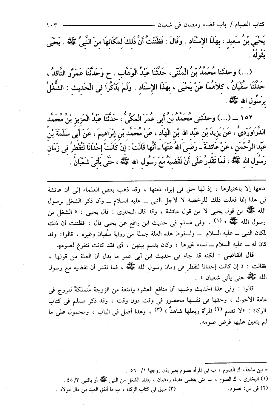 152 - (...) وحدّثنى مُحَمَّدُ بْنُ أَبِى عُمَرَ الْمَكِّىُّ، حَدَّثَنَا عَبْدُ الْعَزِيزِ بْنُ مُحَمَّدٍ الدَّرَاوَرْدِىُّ، عَن يَزِيدَ بْنِ عَبْدِ اللهِ بْنِ الْهَادِ، عَنْ مُحَمَّدِ بْنِ إِبْرَاهِيمَ، عَنْ أَبِى سَلَمَةَ بْنِ عَبْدِ الرَّحْمَنِ، عَنْ عَائِشَةَ - رَضِىَ اللهُ عَنْهَا - أَنَّهَا قَالَتْ: إِنْ كَانَتْ إِحْدَانَا لَتُفْطِرُ فِى زَمَانِ رَسُولِ اللهِ صَلَّى اللهُ عَلَيْهِ وَسَلَّمَ، فَمَا تَقْدِرُ عَلَى أَنْ تَقْضِيَهُ مَعَ رَسُولِ اللهِ صَلَّى اللهُ عَلَيْهِ وَسَلَّمَ، حَتَّى يَأْتِىَ شَعْبَانُ.