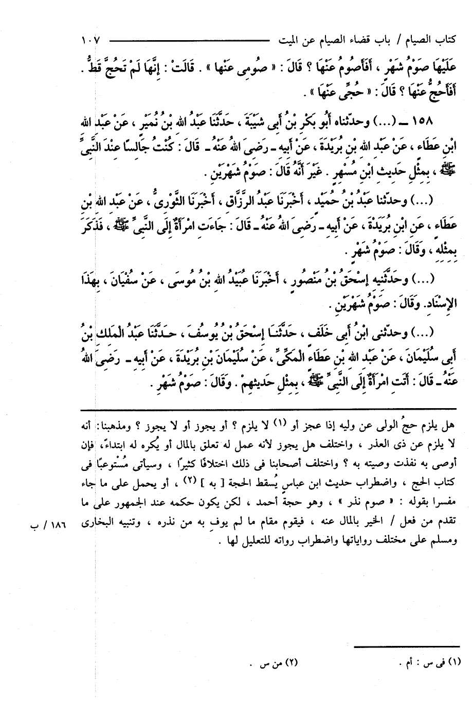 158 - (...) وحدّثناه أَبُو بَكْرِ بْنُ أَبِى شَيْبَةَ، حَدَّثَنَا عَبْدُ اللهِ بْنُ نُمَيْرٍ، عَنْ عَبْدِ اللهِ ابْنِ عَطَاءٍ، عَنْ عَبْدِ اللهِ بْنِ بُرَيْدَةَ، عَنْ أَبِيهِ - رَضِىَ اللهُ عَنْهُ - قَالَ: كُنْتُ جَالِسًا عِنْدَ النَّبِىِّ صَلَّى اللهُ عَلَيْهِ وَسَلَّمَ، بِمِثلِ حَدِيثِ ابْنِ مُسْهِرٍ. غَيْرَ أَنَّهُ قَالَ: صَوْمُ شَهْرَيْنِ.