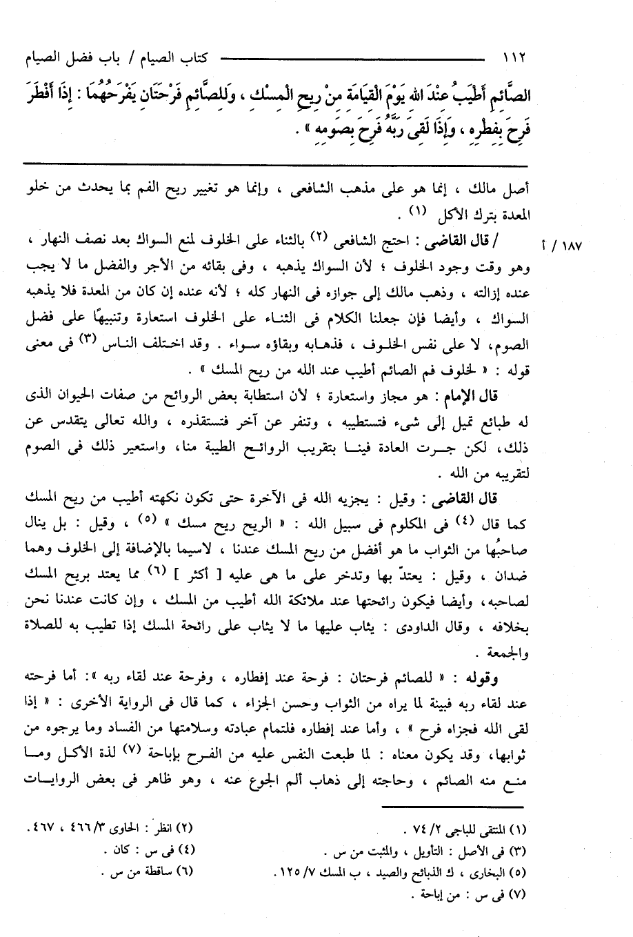 وقوله: " للصائم فرحتان: فرحة عند إفطاره، وفرحة عند لقاء ربه ": أما فرحته عند لقاء ربه فبينة لما يراه من الثواب وحسن الجزاء، كما قال فى الرواية الاخرى: " إذا لقى الله فجزاه فرح "، وأما عند إفطاره فلتمام عبادته وسلامتها من الفساد وما يرجوه من ثوابها، وقد يكون معناه: لما طبعت النفس عليه من الفرح بإباحة (¬7) لذة الأكل وما منع منه الصائم، وحاجته إلى ذهاب ألم الجوع عنه، وهو ظاهر فى بعض الروايات
