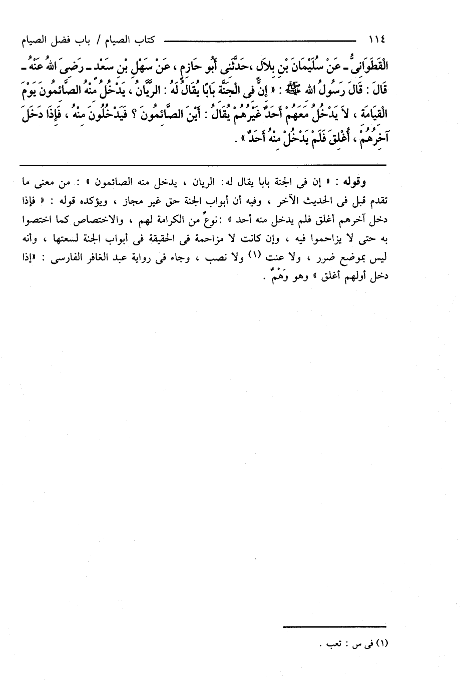 الْقَطَوَانِىُّ - عَنْ سُلَيْمَانَ بْنِ بِلَالٍ، حَدَّثَنِى أَبُو حَازِمٍ، عَنْ سَهْلِ بْنِ سَعْدٍ - رَضِىَ اللهُ عَنْهُ - قَالَ: قَالَ رَسُولُ اللهِ صَلَّى اللهُ عَلَيْهِ وَسَلَّمَ: " إِنَّ فِى الْجَنَّةِ بَابًا يُقَالُ لَهُ: الرَّيَّانُ، يَدْخُلُ مِنْهُ الصَّائِمُونَ يَوْمَ الْقِيَامَةِ، لَا يَدْخُلُ مَعَهُمْ أَحَدٌ غَيْرُهُمْ يُقَاَلُ: أَيْنَ الصَّائِمُونَ؟ فَيَدْخُلُونَ مِنْهُ، فَإِذَا دَخَلَ آخِرُهُمْ، أُغْلِقَ فَلَمْ يَدْخُلْ مِنْهُ أَحَدٌ ".