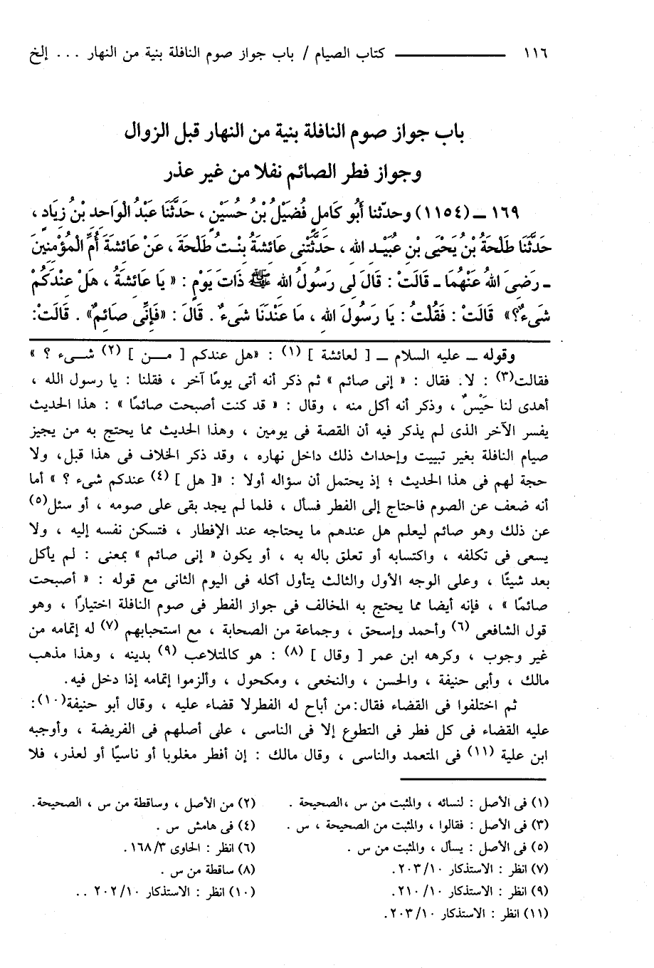 169 - (1154) وحدّثنا أَبُو كَامِلٍ فُضَيْلُ بْنُ حُسَيْنٍ، حَدَّثَنَا عَبْدُ الْوَاحِدِ بْنُ زِيَادٍ، حَدَّثَنَا طَلْحَةُ بْنُ يَحْيَى بْنِ عُبَيْدِ اللهِ، حَدَّثَتْنِى عَائِشَةُ بِنْتُ طَلْحَةَ، عَنْ عَائِشَةَ أُمِّ الْمُؤْمِنِينَ - رَضِىَ اللهُ عَنْهُمَا - قَالَتْ: قَالَ لِى رَسُولُ اللهِ صَلَّى اللهُ عَلَيْهِ وَسَلَّمَ ذَاتَ يَوْمٍ: " يَا عَائِشَةُ، هَلْ عِنْدَكُمْ شَىءٌ؟ " قَالَتْ: فَقُلْتُ: يَا رَسُولَ اللهِ، مَا عِنْدَنَا شَىءٌ. قَالَ: " فَإِنِّى صَائِمٌ ". قَالَتْ: