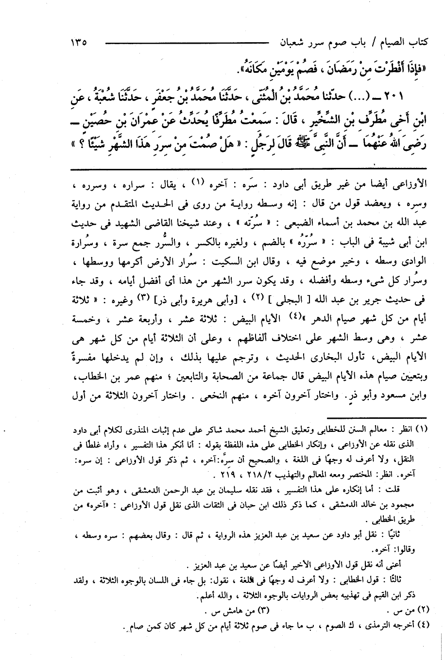 201 - (...) حدَّثنا مُحَمَّدُ بْنُ الْمُثَنَّى، حَدَّثَنَا مُحَمَّدُ بْنُ جَعْفَرٍ، حَدَّثَنَا شُعْبَةُ، عَنِ ابْنِ أَخِى مُطَرَّفِ بْنِ الشِّخِّيرِ، قَالَ: سَمِعْتُ مُطَرِّفًا يُحَدِّثُ عَنْ عِمْرَانَ بْنِ حُصَيْنٍ - رَضِىَ اللهُ عَنْهُمَا - أن النَّبِىَّ صَلَّى اللهُ عَلَيْهِ وَسَلَّمَ قَالَ لِرَجُلٍ: " هَلْ صُمْتَ مِنْ سِرَرِ هَذَا الشَّهْرِ شَيْئًا؟ "