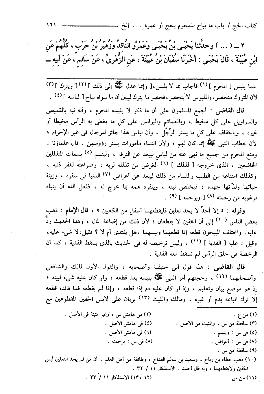(¬10) ذهب عطاء بن رباح، وسعيد بن سالم القداح، وطائفة من أهل العلم، أن من لم يجد النعلين لبس الخفين ولا يقطعهما، وبه قال أحمد. الاستذكار 11/ 32.