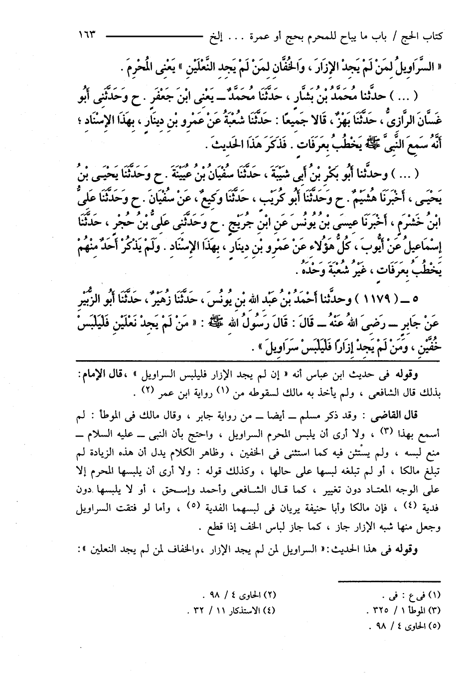وقوله فى حديث ابن عباس أنه " إن لم يجد الإزار فليلبس السراويل "، قال الإمام: بذلك قال الشافعى، ولم يأخذ به مالك لسقوطه من (¬1) رواية ابن عمر (¬2).