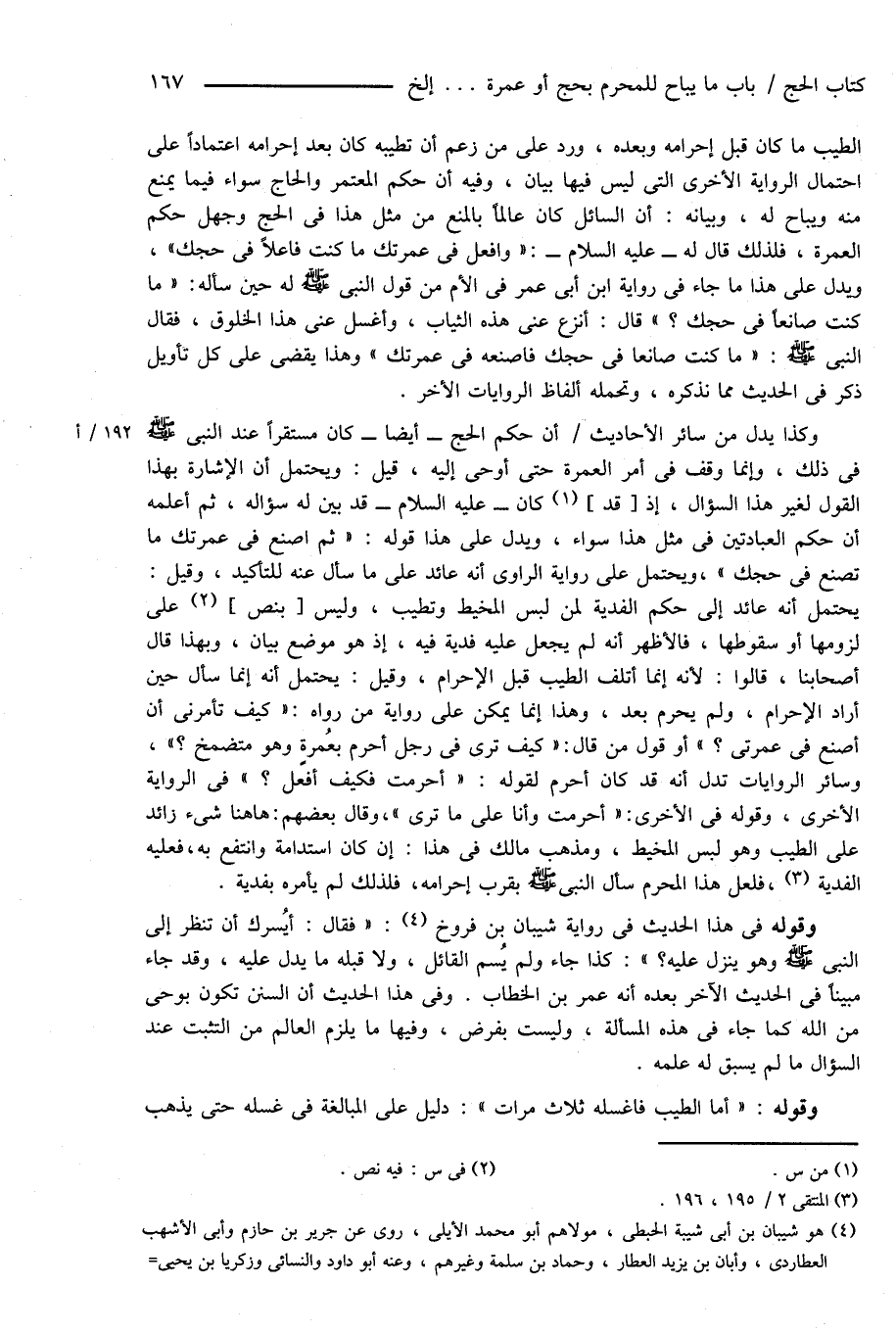 الطيب ما كان قبل إحرامه وبعده، ورد على من زعم أن تطيبه كان بعد إحرامه اعتماداً على احتمال الرواية الأخرى التى ليس فيها بيان، وفيه أن حكم المعتمر والحاج سواء فيما يمنع منه ويباح له، وبيانه: أن السائل كان عالماً بالمنع من مثل هذا فى الحج وجهل حكم العمرة، فلذلك قال له - عليه السلام -: " وافعل فى عمرتك ما كنت فاعلاً فى حجك "، ويدل على هذا ما جاء فى رواية ابن أبى عمر فى الأم من قول النبى صَلَّى اللهُ عَلَيْهِ وَسَلَّمَ له حين سأله: " ما كنت صانعاً فى حجك؟ " قال: أنزع عنى هذه الثياب، وأغسل عنى هذا الخلوق، فقال النبى صَلَّى اللهُ عَلَيْهِ وَسَلَّمَ: " ما كنت صانعاً فى حجك فاصنعه فى عمرتك " وهذا يقضى على كل تأويل ذكر فى الحديث مما نذكره، وتحمله ألفاظ الروايات الأخر.