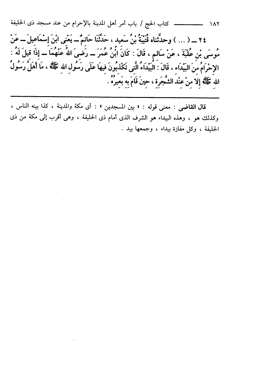 24 - (...) وحدَّثناه قُتَيْبَةُ بْنُ سَعِيدٍ، حَدَّثَنَا حَاتِمٌ - يَعْنِى ابْنَ إِسْمَاعِيلَ - عَنْ مُوسَى بْنِ عُقْبَةَ، عَنْ سَالِمٍ، قَالَ: كَانَ ابْنُ عُمَرَ - رَضِىَ اللهُ عَنْهُمَا - إِذَا قِيلَ لَهُ: الإِحْرَامُ مِنَ البَيْدَاءِ، قَالَ: البَيْدَاءُ الَّتِى تَكْذِبُونَ فِيهَا عَلَى رَسُولِ اللهِ صَلَّى اللهُ عَلَيْهِ وَسَلَّمَ، مَا أَهَلَّ رَسُولُ اللهِ صَلَّى اللهُ عَلَيْهِ وَسَلَّمَ إِلا مِنْ عِنْد الشَّجَرِةِ، حِينَ قَامَ بِهِ بَعِيرُهُ.