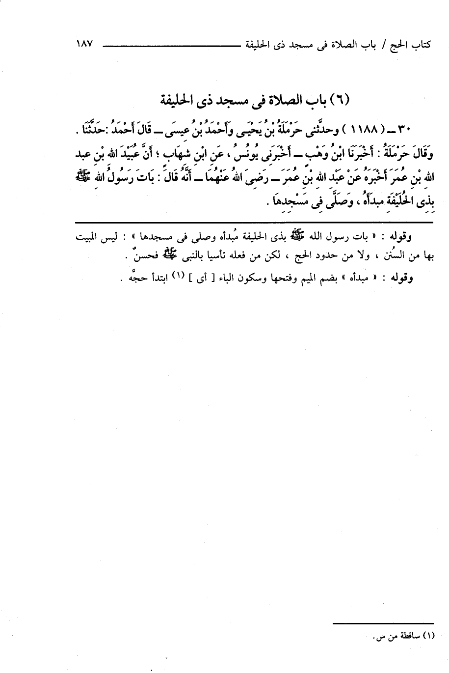 30 - (1188) وحدَّثنى حَرْمَلَةُ بْنُ يَحْيَى وَأَحْمَدُ بْنُ عِيسَى - قَالَ أَحْمَدُ: حَدَّثَنَا. وَقَالَ حَرْمَلَةُ: أَخْبَرَنَا ابْنُ وَهْبٍ - أَخْبَرَنِى يُونُسُ، عَنِ ابْنِ شِهَابٍ؛ أَنَّ عُبَيْدَ اللهِ بْنِ عَبْد اللهِ بْنِ عُمَرَ أَخْبَرَهُ عَنْ عَبْدِ اللهِ بْنِ عُمَرَ - رَضِىَ اللهُ عَنْهُمَا - أَنَّهُ قَالَ: بَاتَ رَسُولُ اللهِ صَلَّى اللهُ عَلَيْهِ وَسَلَّمَ بِذِى الحُلَيْفَةِ مبدَأَهُ، وَصَلَّى فِى مَسْجِدِهَا.