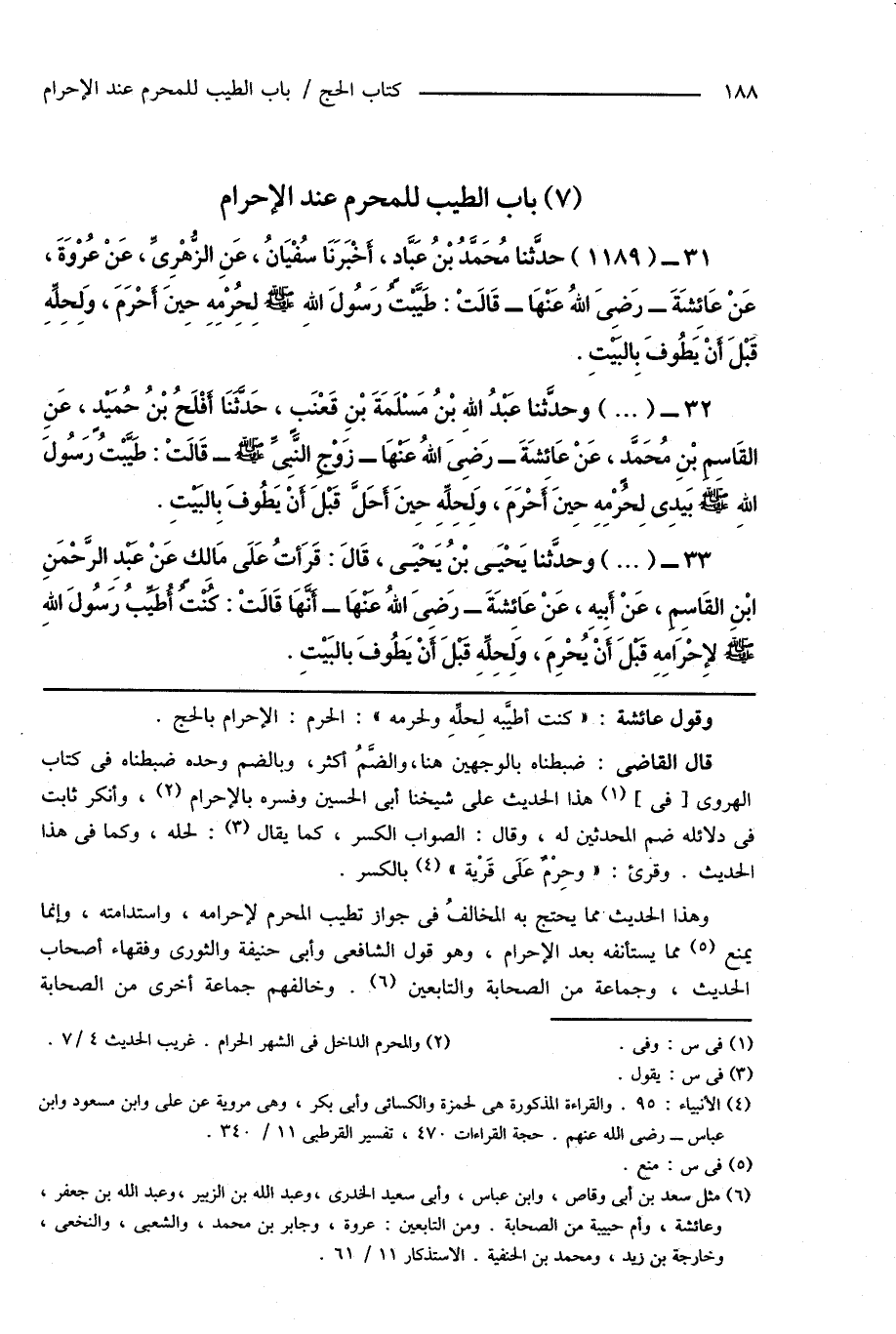 33 - (...) وحدَّثنا يَحْيَى بْنُ يَحْيَى، قَالَ: قَرَأْتُ عَلَى مَالِكٍ عَنْ عبدِ الرَّحْمَنِ ابْنِ القَاسِمِ، عَنْ أَبِيهِ، عَنْ عَائِشَةَ - رَضِىَ اللهُ عَنْهَا - أَنَّهَا قَالَتْ: كُنْتُ أُطَيِّبُ رَسُولَ اللهِ صَلَّى اللهُ عَلَيْهِ وَسَلَّمَ لإِحْرَامِهِ قَبْلَ أَنْ يُحْرِمَ، وَلِحِلِّهِ قَبْلَ أَنْ يَطُوفَ بِالبَيْتِ.