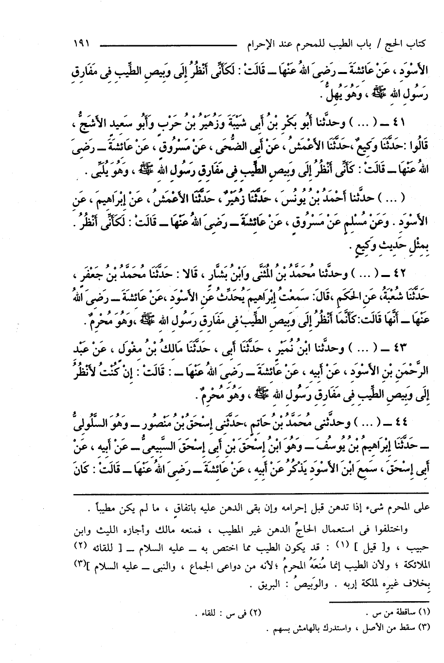 43 - (...) وحدَّثنا ابْنُ نُمَيْرٍ، حَدَّثَنَا أَبِى، حَدَّثَنَا مَالِكُ بْنُ مِغْوَلٍ، عَنْ عَبْدِ الرَّحْمَنِ بْنِ الأَسْوَدِ، عَنْ أَبِيهِ، عَنْ عَائِشَةَ - رَضِىَ اللهُ عَنْهَا -: قَالَتْ: إِنْ كُنْتُ لأَنْظُرُ إِلَى وَبِيصِ الطِّيبِ فِى مَفَارِقَ رَسُولِ اللهِ صَلَّى اللهُ عَلَيْهِ وَسَلَّمَ، وَهُوَ مُحْرِمٌ.