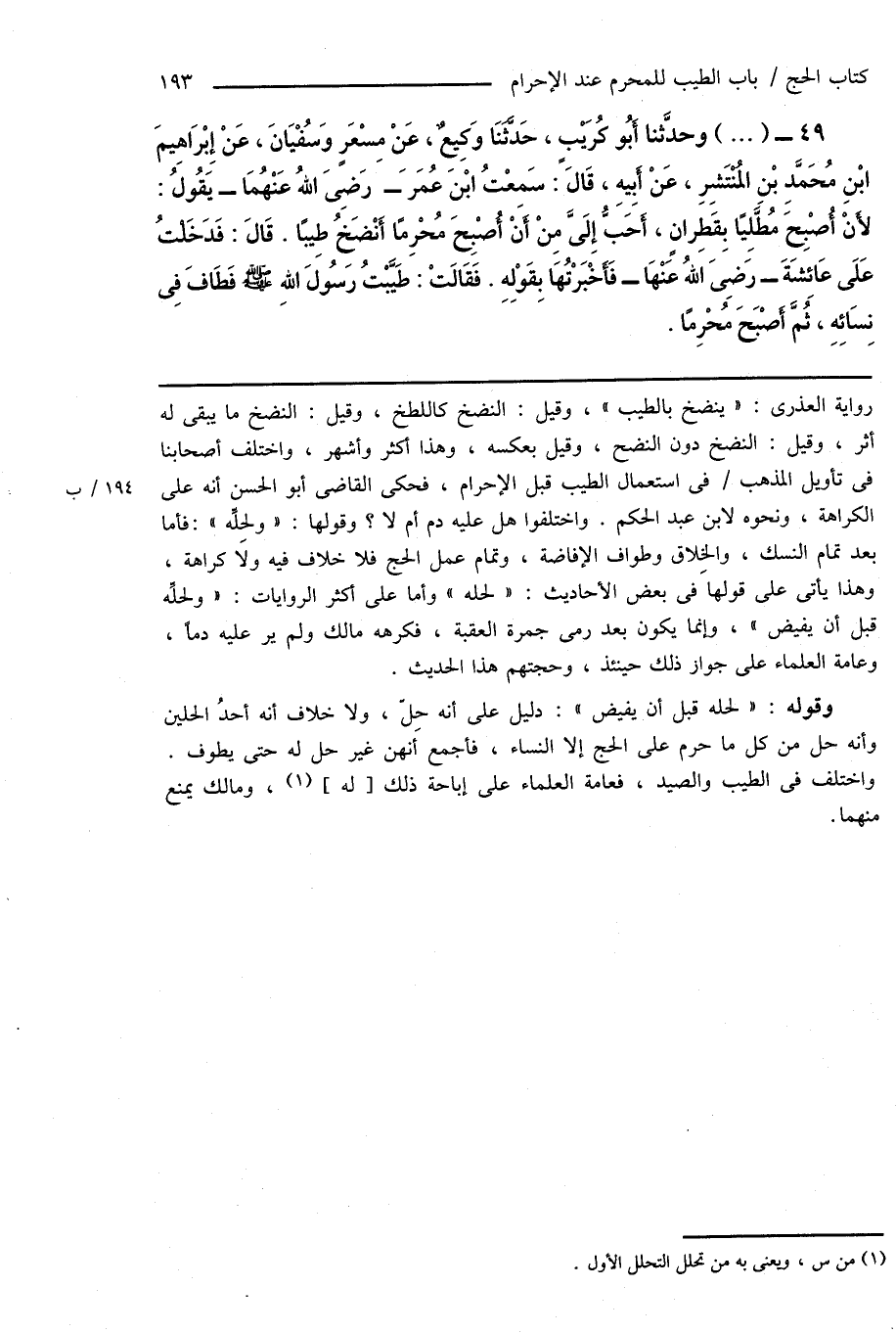 49 - (...) وحدَّثنا أَبُو كُرَيْبٍ، حَدَّثَنَا وَكِيعٌ، عَنْ مِسْعَرٍ وَسُفْيَانَ، عَنْ إِبْرَاهِيمَ ابْنِ مُحَمَّدِ بْنِ المُنْتَشِرِ، عَنْ أَبِيهِ، قَالَ: سَمِعْتُ ابْنَ عُمَرَ - رَضِىَ اللهُ عَنْهُمَا - يَقُولُ: لأَنْ أُصْبِحَ مُطَّلِيًا بِقَطِرانٍ، أَحَبُّ إِلَىَّ مِنْ أَنَّ أُصْبِحَ مُحْرِمًا أَنْضَخُ طِيبًا. قَالَ: فَدَخَلْتُ عَلَى عَائِشَةَ - رَضِىَ اللهُ عَنْهَا - فَأَخْبَرْتُهَا بِقَوْلِهِ. فَقَالَتْ: طَيَّبْتُ رَسُولَ اللهِ صَلَّى اللهُ عَلَيْهِ وَسَلَّمَ فَطَافَ فِى نِسَائِهِ، ثُمَّ أَصْبَحَ مُحْرِمًا.
