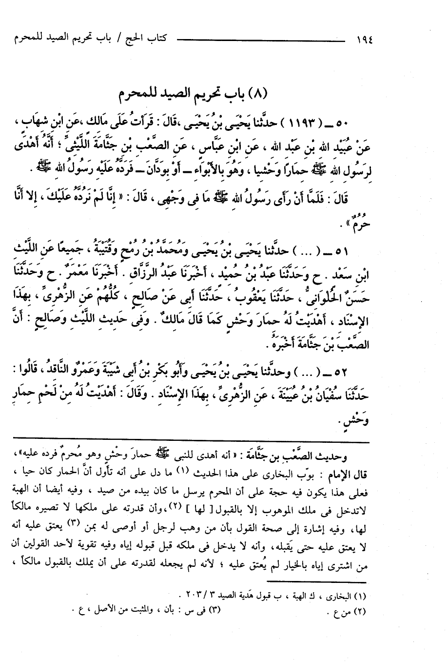 50 - (1193) حدَّثنا يَحْيَى بْنُ يَحْيَى، قَالَ: قَرَأْتُ عَلَى مَالِكٍ، عَن ابْنِ شِهَابٍ، عَنْ عُبَيْدِ اللهِ بْنِ عَبْدِ اللهِ، عَنِ ابْنِ عَبَّاسٍ، عَنِ الصَّعْبِ بْنِ جَثَّامَةَ اللَّيْثِىِّ؛ أَنَّهُ أَهْدَى لِرَسُولِ اللهِ صَلَّى اللهُ عَلَيْهِ وَسَلَّمَ حِمَارًا وَحْشِيًّا، وَهُوَ بِالأَبْوَاءِ - أَوْ بِوَدَّانَ - فَرَدَّهُ عَلَيْهِ رَسُولُ اللهِ صَلَّى اللهُ عَلَيْهِ وَسَلَّمَ.