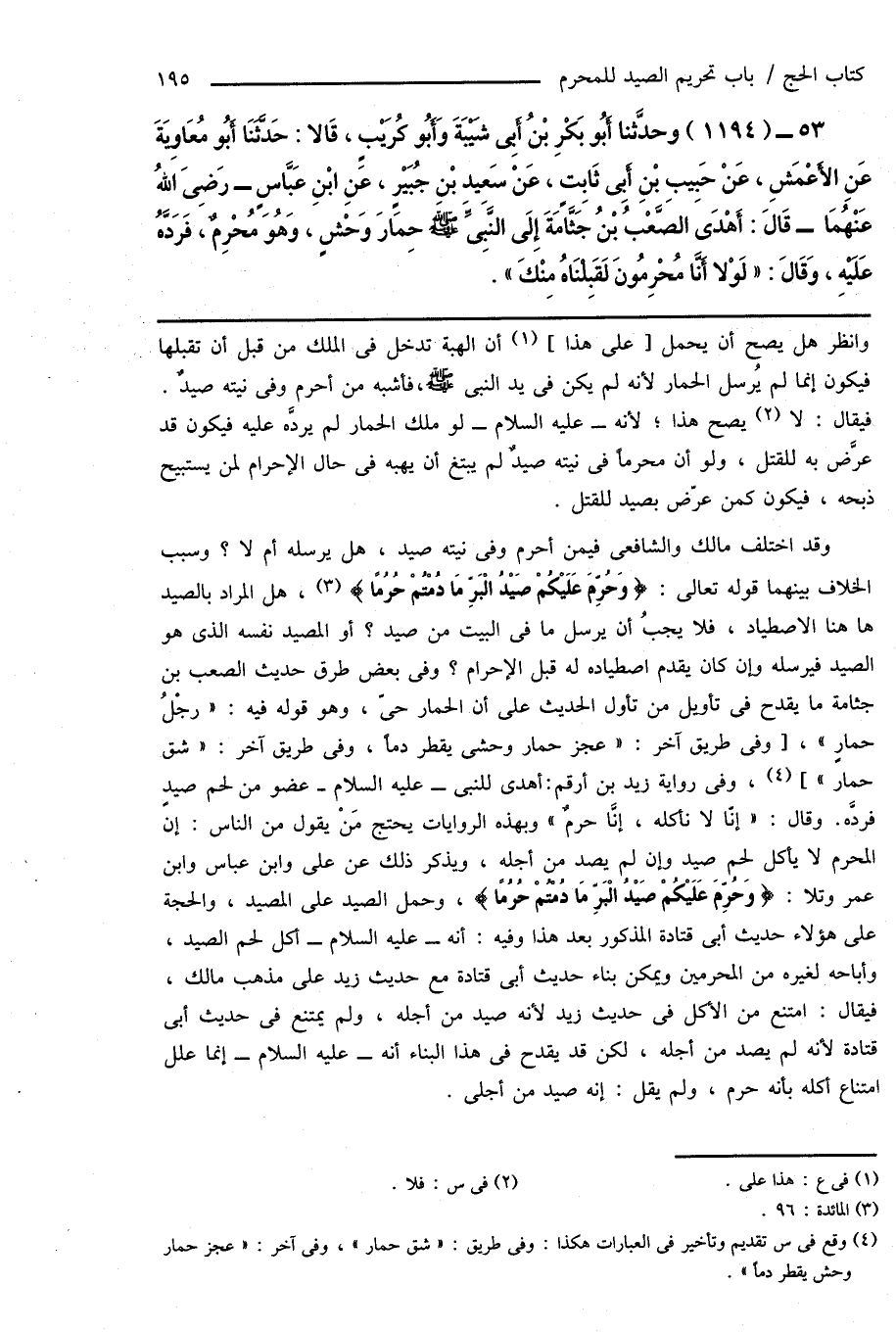 53 - (1194) وحدَّثنا أَبُو بَكْرِ بْنُ أَبِى شَيْبَةَ وَأَبُو كُرَيْبٍ، قَالا: حَدَّثَنَا أَبُو مُعَاوِيَةَ عَنِ الأَعْمَشِ، عَنْ حَبِيبِ بْنِ أَبِى ثَابِتٍ، عَنْ سَعِيدِ بْنِ جُبَيْرٍ، عَنِ ابْنِ عَبَّاسٍ - رَضِىَ اللهُ عَنْهُمَا - قَالَ: أَهْدَى الصَّعْبُ بْنُ جَثَّامَةَ إِلَى النَّبِىِّ صَلَّى اللهُ عَلَيْهِ وَسَلَّمَ حِمَارَ وَحْشٍ، وَهُوَ مُحْرِمٌ، فَرَدَّهُ عَلَيْهِ، وَقَالَ: " لَوْلا أَنَّا مُحْرِمُونَ لَقَبِلْنَاهُ مِنْكَ ".