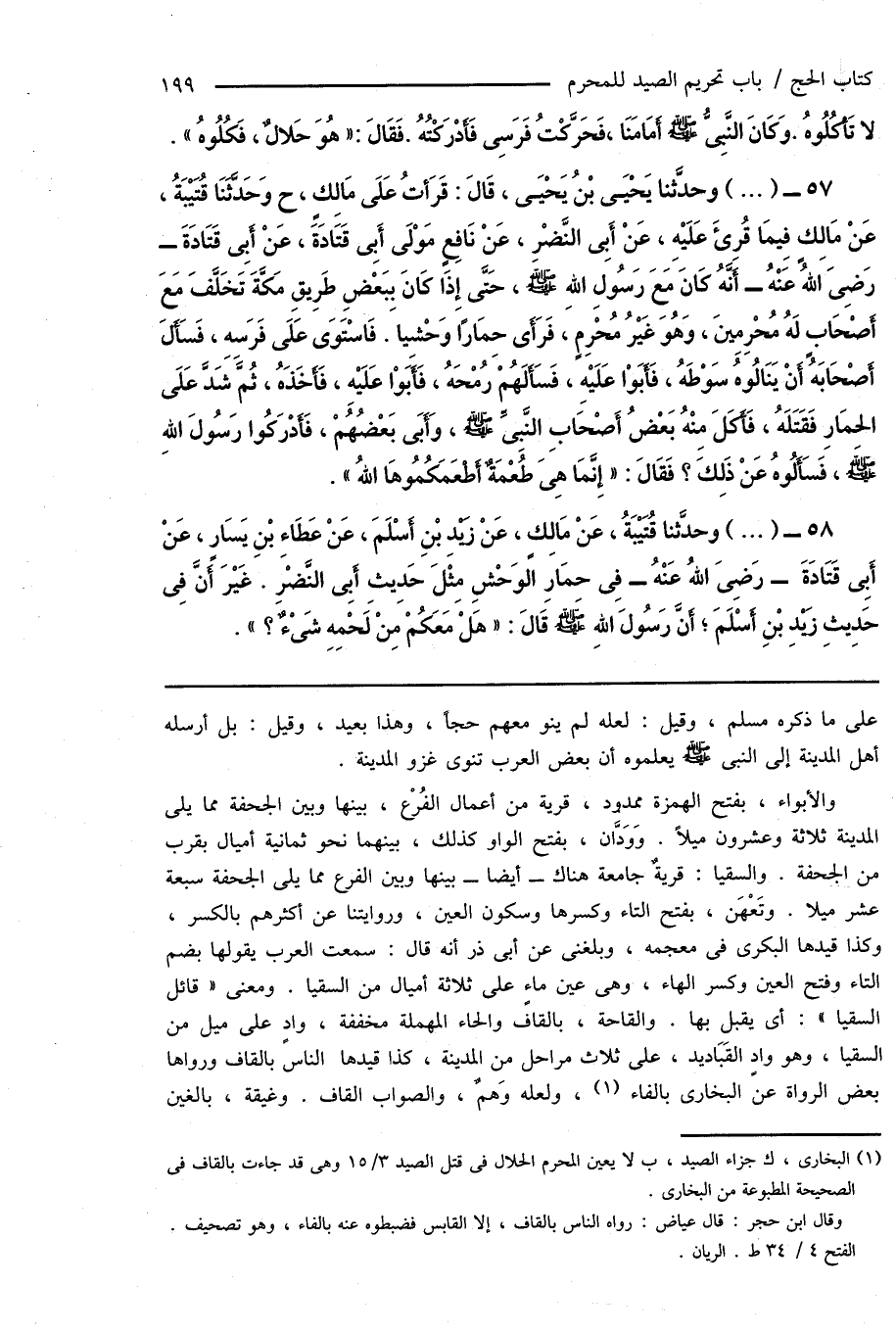 57 - (...) وحدَّثنا يَحْيَى بْنُ يَحْيَى، قَالَ: قَرَأْتُ عَلَى مَالِكٍ، ح وَحَدَّثَنَا قُتَيْبَةُ، عَنْ مَالِكٍ فِيمَا قُرِئَ عَلَيْهِ، عَنْ أَبِى النَّضْرِ، عَنْ نَافِعٍ مَوْلَى أَبِى قَتَادَةَ، عَنْ أَبِى قَتَادَةَ - رَضِىَ اللهُ عَنْهُ - أَنَّهُ كَانَ مَعَ رَسُولِ اللهِ صَلَّى اللهُ عَلَيْهِ وَسَلَّمَ، حَتَّى إِذَا كَانَ بِبَعْضِ طَرِيقِ مَكَّةَ تَخَلَّفَ مَعَ أَصْحَابٍ لَهُ مُحْرِمينَ، وَهُوَ غَيْرُ مُحْرِمٍ، فَرَأَى حِمَارًا وَحْشِيًّا. فَاسْتَوَى عَلَى فَرَسِهِ، فَسَأَلَ أَصْحَابَهُ أَنْ يَنَالُوهُ سَوْطَهُ، فَأَبُوْا عَلَيْهِ، فَسَأَلَهُمْ رُمْحَهُ، فَأَبُوْا عَلَيْهِ، فَأَخَذَهُ، ثُمَّ شَدَّ عَلَى الحِمَارِ فَقَتَلَهُ، فَأَكَلَ مِنْهُ بَعْضُ أَصْحَابِ النَّبِىِّ صَلَّى اللهُ عَلَيْهِ وَسَلَّمَ، وَأَبَى بَعْضُهُمْ، فَأَدْرَكُوا رَسُولَ اللهِ صَلَّى اللهُ عَلَيْهِ وَسَلَّمَ، فَسَأَلُوهُ عَنْ ذَلِكَ؟ فَقَالَ: " إِنَّمَا هِىَ طُعْمَةٌ أَطْعَمَكُمُوهَا اللهُ ".