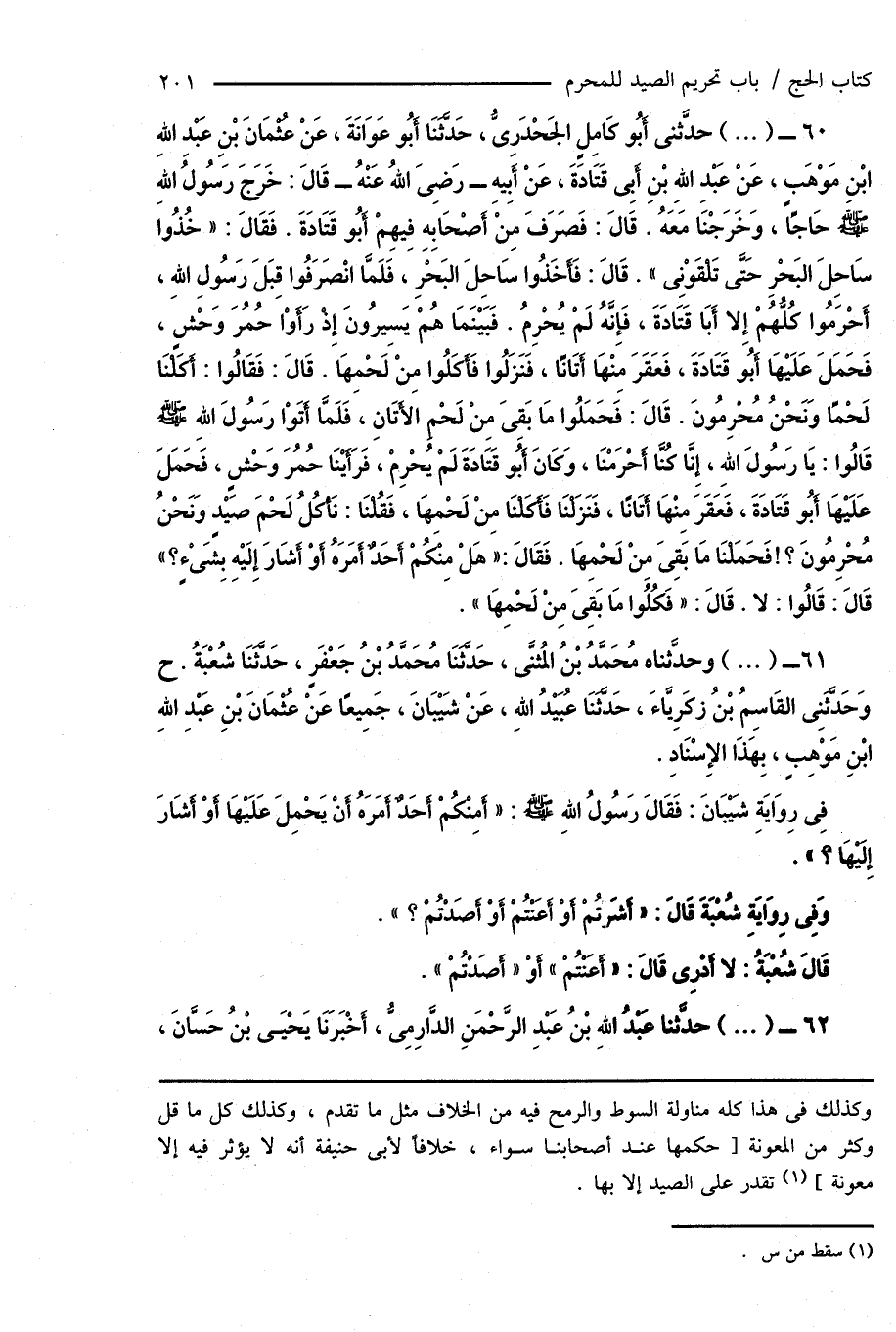 60 - (...) حدَّثنى أَبُو كَامِلٍ الجَحْدَرِىُّ، حَدَّثَنَا أَبُو عَوَانَةَ، عَنْ عُثْمَانَ بْنِ عَبْدِ اللهِ ابْنِ مَوْهَبٍ، عَنْ عَبْدِ اللهِ بْنِ أَبِى قَتَادَةَ، عَنْ أَبِيهِ - رَضِىَ اللهُ عَنْهُ - قَالَ: خَرَجَ رَسُولُ اللهِ صَلَّى اللهُ عَلَيْهِ وَسَلَّمَ حَاجًا، وَخَرَجْنَا مَعَهُ. قَالَ: فَصَرَفَ مِنْ أَصْحَابِهِ فِيهِمْ أَبُو قَتَادَةَ. فَقَالَ: " خُذُوا سَاحِلَ البَحْرِ حَتَّى تَلْقَوْنِى ". قَالَ: فَأَخَذُوا سَاحِلَ البَحْرِ، فَلَمَّا انْصَرَفُوا قِبَلَ رَسُولِ اللهِ، أَحْرَمُوا كُلُّهُمْ إِلا أَبَا قَتَادَةَ، فَإِنَّهُ لَمْ يُحْرِمُ. فَبَيْنَمَا هُمْ يَسِيرُونَ إِذْ رَأَوْا حُمُرَ وَحْشٍ، فَحَمَلَ عَلَيْهَا أَبُو قَتَادَةَ، فَعَقَرَ مِنْهَا أَتَانًا، فَنَزَلُوا فَأَكَلُوا مِنْ لَحْمِهَا. قَالَ: فَقَالُوا: أَكَلْنَا لَحْمًا وَنَحْنُ مُحْرِمُونَ. قَالَ: فَحَمَلُوا مَا بَقِىَ مِنْ لَحْمِ الأَتَانِ، فَلَمَّا أَتَوْا رَسُولَ اللهِ صَلَّى اللهُ عَلَيْهِ وَسَلَّمَ قَالُوا: يَا رَسُولَ اللهِ، إِنَّا كُنَّا أَحْرَمْنَا، وَكَانَ أَبُو قَتَادَةَ لَمْ يُحْرِمْ، فَرَأَيْنَا حُمُرَ وَحْشٍ، فَحَمَلَ عَلَيْهَا أَبُو قَتَادَةَ، فَعَقَرَ مِنْهَا أَتَانًا، فَنَزَلْنَا فَأَكَلْنَا مِنْ لَحْمِهَا، فَقُلْنَا: نَأْكُلُ لَحْمَ صَيْدٍ وَنَحْنُ مُحْرِمُونَ؟! فَحَمَلْنَا مَا بَقِىَ مِنْ لَحْمِهَا. فَقَالَ: " هَلْ مِنْكُمْ أَحَدٌ أَمَرَهُ أَوْ أَشَارَ إِلَيْهِ بِشَىْءٍ؟ " قَالَ: قَالُوا: لا. قَالَ: " فَكُلُوا مَا بَقِىَ مِنْ لَحْمِهَا ".