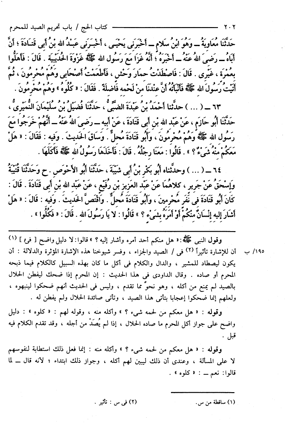 64 - (...) وحدَّثناه أَبُو بَكْرِ بْنُ أَبِى شَيْبَةَ، حَدَّثَنَا أَبُو الأَحْوَصِ. ح وَحَدَّثَنَا قُتَيْبَةُ وَإِسْحَاقُ عَنْ جَرِيرٍ، كِلاهُمَا عَنْ عَبْدِ الْعَزِيزِ بْنِ رُفَيْعٍ، عَنْ عَبْدِ اللهِ بْنِ أَبِى قَتَادَةَ. قَالَ: كَانَ أَبُو قَتَادَةَ فى نَفَرٍ مُحْرِمِينَ، وَأَبُو قَتَادَةَ مُحِلٌّ. وَاقْتَصَّ الحَدِيثَ. وَفيه: قَالَ: " هَلْ أَشَارَ إِليهِ إِنْسَانٌ مِنْكُمْ أَوْ أَمَرَهُ بِشَىْءٍ؟ " قَالُوا: لا يَا رَسُولَ اللهِ. قَالَ: " فَكُلُوا ".
