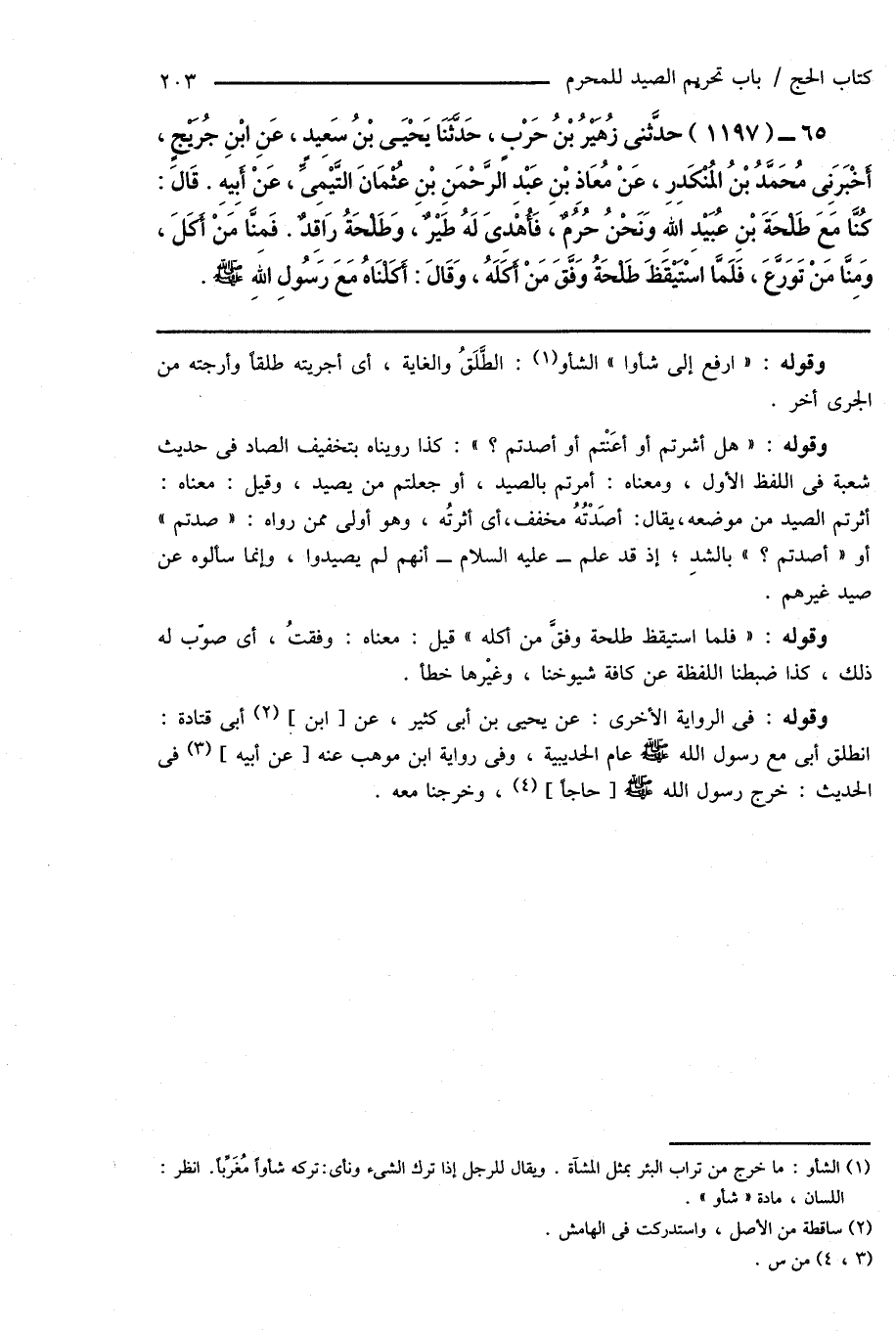 65 - (1197) حدَّثنى زُهَيْرُ بْنُ حَرْبٍ، حَدَّثَنَا يَحْيَى بْنُ سَعِيدٍ، عَنِ ابْنِ جُرَيْجٍ، أَخْبَرَنِى مُحَمَّدُ بْنُ المُنْكَدِرِ، عَنْ مُعَاذِ بْنِ عَبْدِ الرَّحْمَنِ بْنِ عُثْمَانَ التَّيْمِىِّ، عَنْ أَبِيهِ. قَالَ: كُنَّا مَعَ طَلْحَةَ بْنِ عُبَيْدِ اللهِ وَنَحْنُ حُرُمٌ، فَأُهْدِىَ لَهُ طَيْرٌ، وَطَلْحَةُ رَاقِدٌ. فَمِنَّا مَنْ أَكَلَ، وَمِنَّا مَنْ تَوَرَّعَ، فَلَمَّا اسْتَيْقَظَ طَلْحَةُ وَفَّقَ مَنْ أَكَلَهُ، وَقَالَ: أَكَلْنَاهُ مَعَ رسُولِ اللهِ صَلَّى اللهُ عَلَيْهِ وَسَلَّمَ.