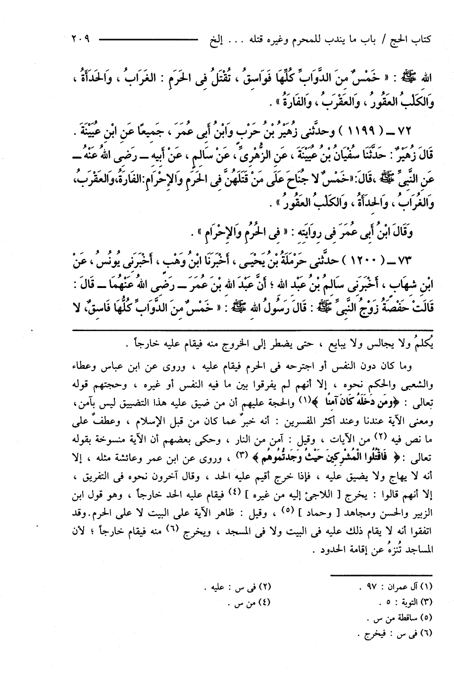 72 - (1199) وحدَّثنى زُهَيرُ بْنُ حَرْبٍ وَابْنُ أَبِى عُمَرَ، جَمِيعًا عَنِ ابْنِ عُيَيْنَةَ. قَالَ زُهَيْرٌ: حَدَّثَنَا سُفْيَانُ بْنُ عُيَيْنَةَ، عَنِ الزُّهْرِىِّ، عَنْ سَالِمٍ، عَنْ أَبِيهِ - رَضِىَ اللهُ عَنْهُ - عَنِ النَّبِىِّ صَلَّى اللهُ عَلَيْهِ وَسَلَّمَ، قَالَ: " خَمْسٌ لا جُنَاحَ عَلَى مَنْ قَتَلَهُنَّ فِى الحَرَمِ وَالإِحْرَامِ: الفَارَةُ، وَالعَقْرَبُ، وَالغُرَابُ، وَالحِدَأَةُ، وَالكَلْبُ العَقُورُ ".