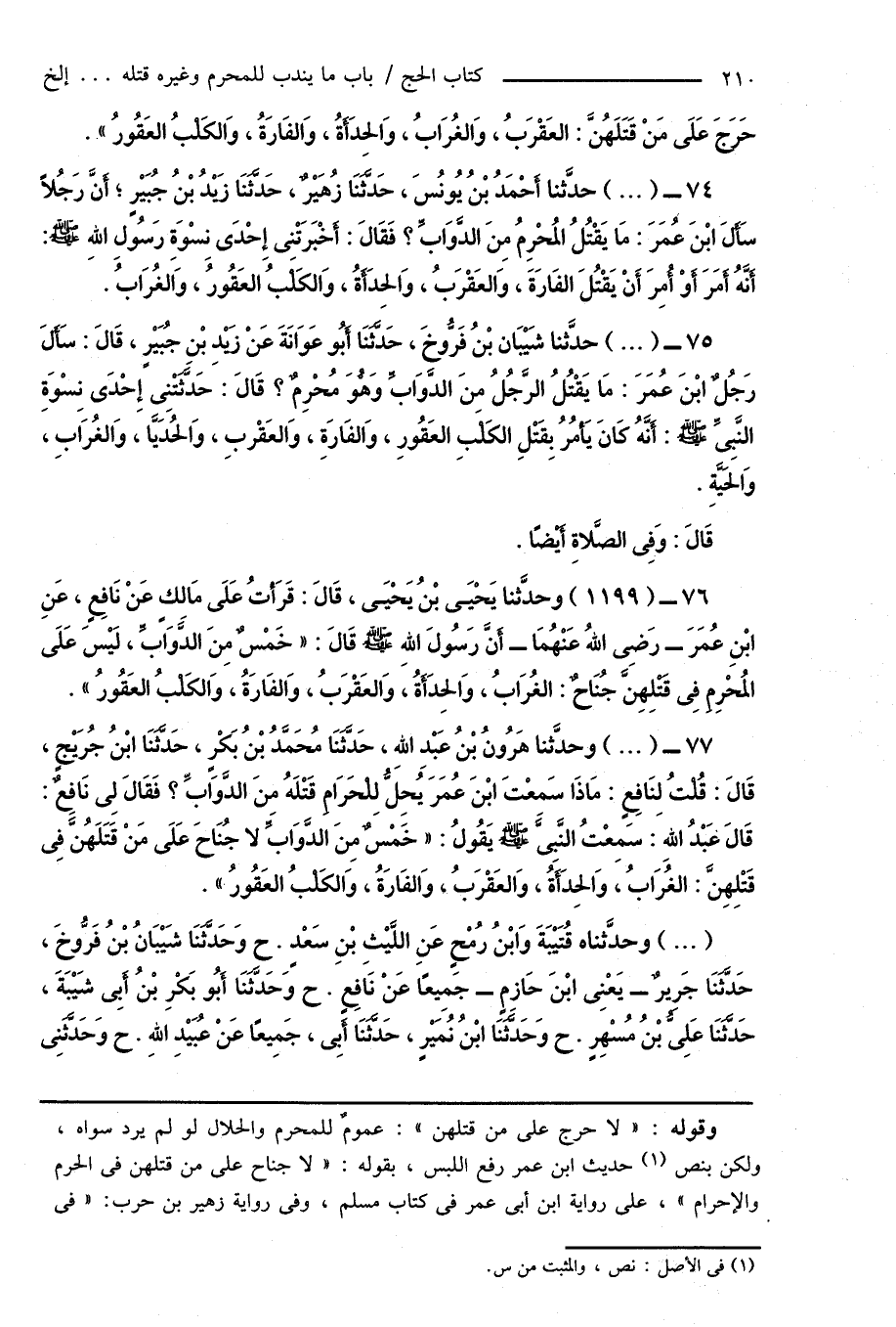 76 - (1199) وحدَّثنا يَحْيَى بْنُ يَحْيَى، قَالَ: قَرَأْتُ عَلَى مَالِكٍ عَنْ نَافِعٍ، عَنِ ابْنِ عُمَرَ - رَضِىَ اللهُ عَنْهُمَا - أَنَّ رَسُولَ اللهِ صَلَّى اللهُ عَلَيْهِ وَسَلَّمَ قَالَ: " خَمْسٌ مِنَ الدَّوَابِّ، لَيْسَ عَلَى المُحْرِمِ فِى قَتْلِهِنَّ جُنَاحٌ: الغُرَابُ، وَالحِدَأَةُ، وَالعَقْرَبُ، وَالفَارَةُ، وَالكَلْبُ العَقُورُ ".