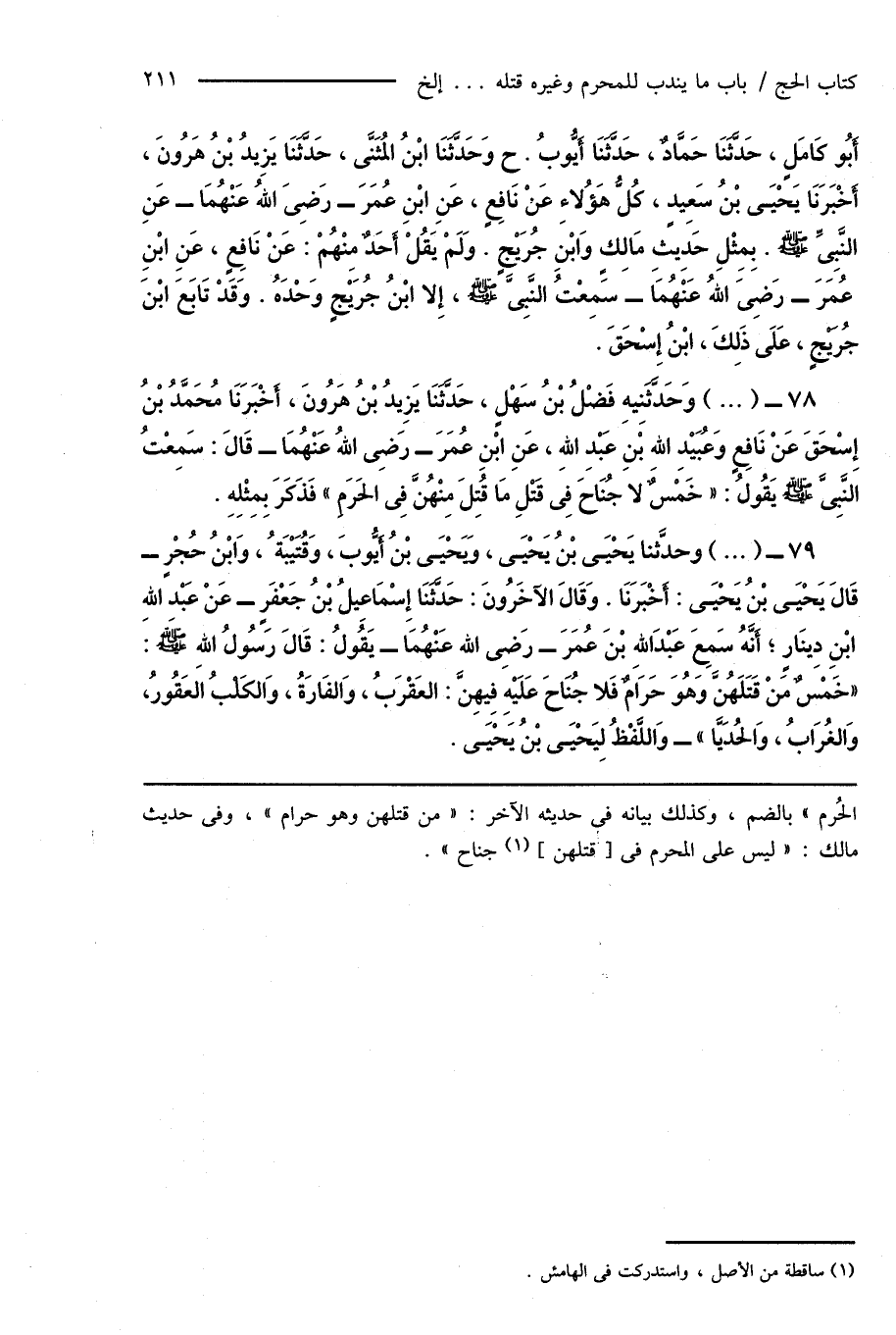 78 - (...) وَحَدَّثَنِيهِ فَضْلُ بْنُ سَهْلٍ، حَدَّثَنَا يَزِيدُ بْنُ هَارُونَ، أَخْبَرَنَا مُحَمَّدُ بْنُ إِسْحَاقَ عَنْ نَافِعٍ وَعُبَيْدِ اللهِ بْنِ عَبْدِ اللهِ، عَنِ ابْنِ عُمَرَ - رَضِىَ اللهُ عَنْهُمَا - قَالَ: سَمِعْتُ النَّبِىَّ صَلَّى اللهُ عَلَيْهِ وَسَلَّمَ يَقُولُ: " خَمْسٌ لا جُنَاحَ فِى قَتْلِ مَا قُتِلَ مِنْهُنَّ فِى الحَرَمِ " فَذَكَرَ بِمِثْلِهِ.