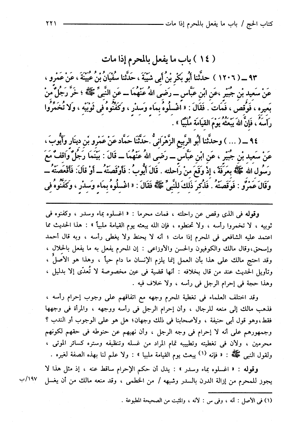 93 - (1206) حدَّثنا أَبُو بَكْرِ بْنُ أَبِى شَيْبَةَ، حَدَّثَنَا سُفْيَانُ بْنُ عُيَيْنَةَ، عَنْ عَمْرٍو، عَنْ سَعِيدِ بْنِ جُبَيْرٍ، عَنِ ابْنِ عَبَّاسٍ - رَضِىَ اللهُ عَنْهُمَا - عَنِ النَّبِىِّ صَلَّى اللهُ عَلَيْهِ وَسَلَّمَ؛ خَرَّ رَجُلٌ مِنْ بَعِيرِهِ، فَوُقِص، فَمَاتَ. فَقَالَ: " اغْسِلُوهُ بِمَاءٍ وَسِدْرٍ، وَكَفِّنُوهُ فِى ثَوْبَيْهِ، وَلا تُخَمِّرُوا رَأْسَهُ، فَإِنَّ اللهَ يَبْعَثُهُ يَوْمَ القِيَامَةِ مُلَبِّيًا ".