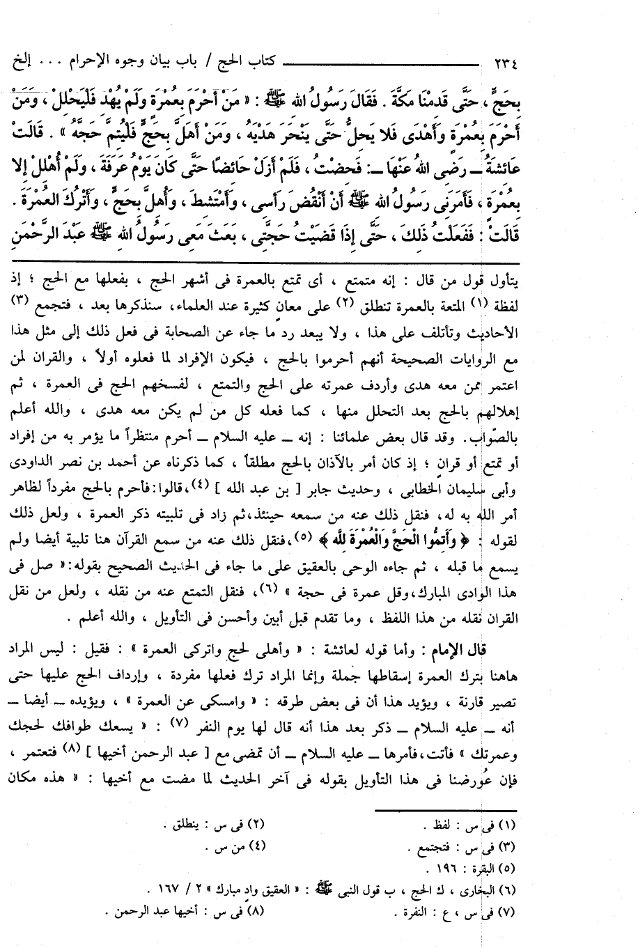 قال الإمام: وأما قوله لعائشة: " وأهلى لحج واتركى العمرة ": فقيل: ليس المراد هاهنا بترك العمرة إسقاطها جملة وإنما المراد ترك فعلها مفردة، وإرداف الحج عليها حتى تصير قارنة، ويؤيد هذا أن فى بعض طرقه: " وامسكى عن العمرة "، ويؤيده - أيضاً - أنه - عليه السلام - ذكر بعد هذا أنه قال لها يوم النفر (¬7): " يسعك طوافك لحجك وعمرتك " فأتت، فأمرها - عليه السلام - أن تمضى مع [عبد الرحمن أخيها] (¬8) فتعتمر، فإن عُورضنا فى هذا التأويل بقوله فى آخر الحديث لما مضت مع أخيها: " هذه مكان