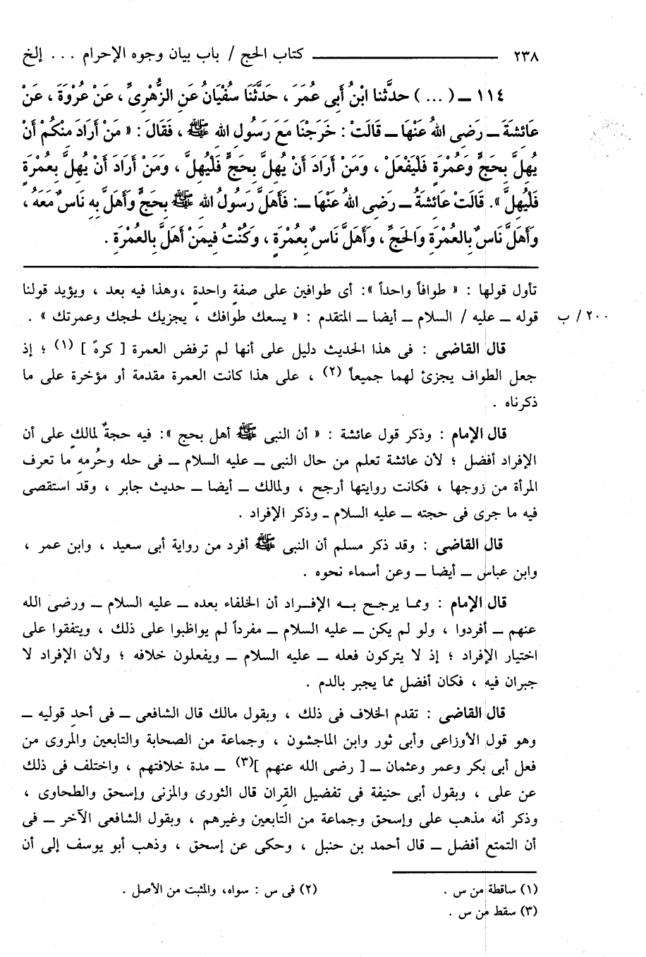 قال القاضى: وقد ذكر مسلم أن النبى صَلَّى اللهُ عَلَيْهِ وَسَلَّمَ أفرد من رواية أبى سعيد، وابن عمر، وابن عباس - أيضاً - وعن أسماء نحوه.