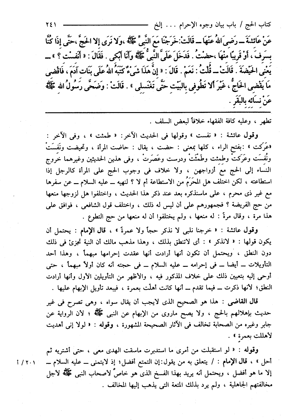 قال القاضى: هذا هو الصحيح الذى لا يجب أن يقال سواه، وهى تصرح فى غير حديث بإهلالهم بالحج، ولا يصح ما روى من الإبهام عن النبى صَلَّى اللهُ عَلَيْهِ وَسَلَّمَ؛ لأن الرواية عن جابر وغيره من الصحابة تخالف فى الآثار الصحيحة المشهورة، وقوله: " لولا إنى أهديت لأهللت بعمرةٍ ".