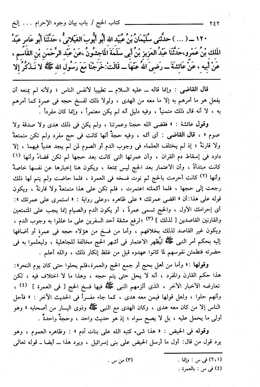 وقولها: " وأما من أهل بحج أو جمع الحج والعمرة، فلم يحلوا حتى كان يوم النحر ": هذا حكم القارن والمفرد، أنه لا يحل حتى يتم حجه، وهذا ما لا اختلاف فيه، لكن تعارضه الأخبار الأخر، الذى ألزمهم النبى صَلَّى اللهُ عَلَيْهِ وَسَلَّمَ فيها فسخ الحج [فى العمرة] (¬4)، وأنهم حلوا، ولعل قولها فيمن معه هدى، كما جاء مفسراً فى الحديث الآخر: " فأحل الناس إلا من كان معه هدى، وكان الهدى مع النبى صَلَّى اللهُ عَلَيْهِ وَسَلَّمَ وذوى اليسار من أصحابه " وهو أولى ما يحمل عليه، بل لا يصح سواه؛ إذ هو حديث واحد، وحجةٌ واحدةٌ.