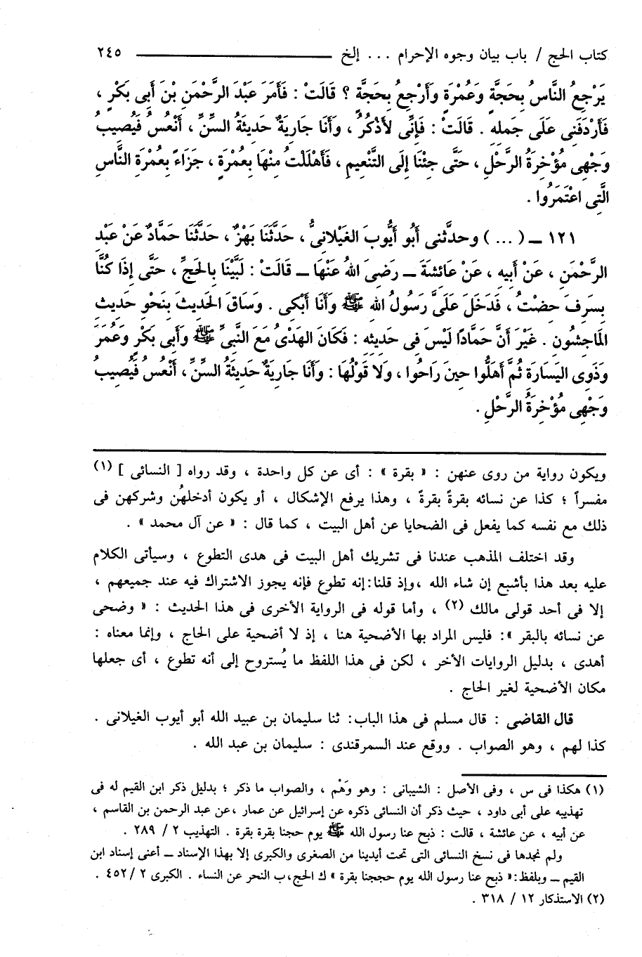121 - (...) وحدَّثنى أَبُو أَيُّوبَ الغَيْلانِىُّ، حَدَّثَنَا بَهْزٌ، حَدَّثَنَا حَمَّادٌ عَنْ عَبْدِ الرَّحْمَنِ، عَنْ أَبِيهِ، عَنْ عَائِشَةَ - رَضِىَ اللهُ عَنْهَا - قَالَتْ: لَبَّيْنَا بِالحَجِّ، حَتَّى إِذَا كُنَّا بِسَرِفَ حِضْتُ، فَدَخَلَ عَلَىَّ رَسُولُ اللهِ صَلَّى اللهُ عَلَيْهِ وَسَلَّمَ وَأَنَا أَبْكِى. وَسَاقَ الحَدِيثَ بِنَحْوِ حَدِيثِ المَاجِشُونِ. غَيْرَ أَنَّ حَمَّادًا لَيْسَ فِى حَدِيثِهِ: فَكَانَ الهَدْىُ مَعَ النَّبِىِّ صَلَّى اللهُ عَلَيْهِ وَسَلَّمَ وَأَبِى بَكْرٍ وَعُمَرَ وَذَوِى اليَسَارَةِ ثُمَّ أَهَلُّوا حِينَ رَاحُوا، وَلَا قَوْلُهَا: وَأَنَا جَارِيَةٌ حَدِيثَةُ السِّنِّ، أَنْعُسُ فَيصِيبُ وَجْهِى مُؤْخِرَةُ الرَّحْلِ.