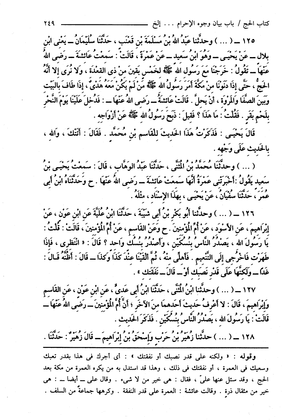 127 - (...) وحدَّثنا ابْنُ الْمُثَنَّى، حَدَّثَنَا ابْنُ أَبِى عَدِىٍّ، عَنِ ابْنِ عَوْنٍ، عَنِ القَاسِمِ وَإِبْرَاهِيمَ، قَالَ: لا أَعْرِفُ حَدِيثَ أَحَدِهِمَا مِنَ الآخَرِ؛ أَنَّ أُمَّ المُؤْمِنِينَ - رَضِىَ اللهُ عَنْهَا - قَالَتْ: يَا رَسُولَ اللهِ، يَصْدُرُ النَّاسُ بِنُسَكِيْنِ. فَذَكَرَ الحَدِيثِ.