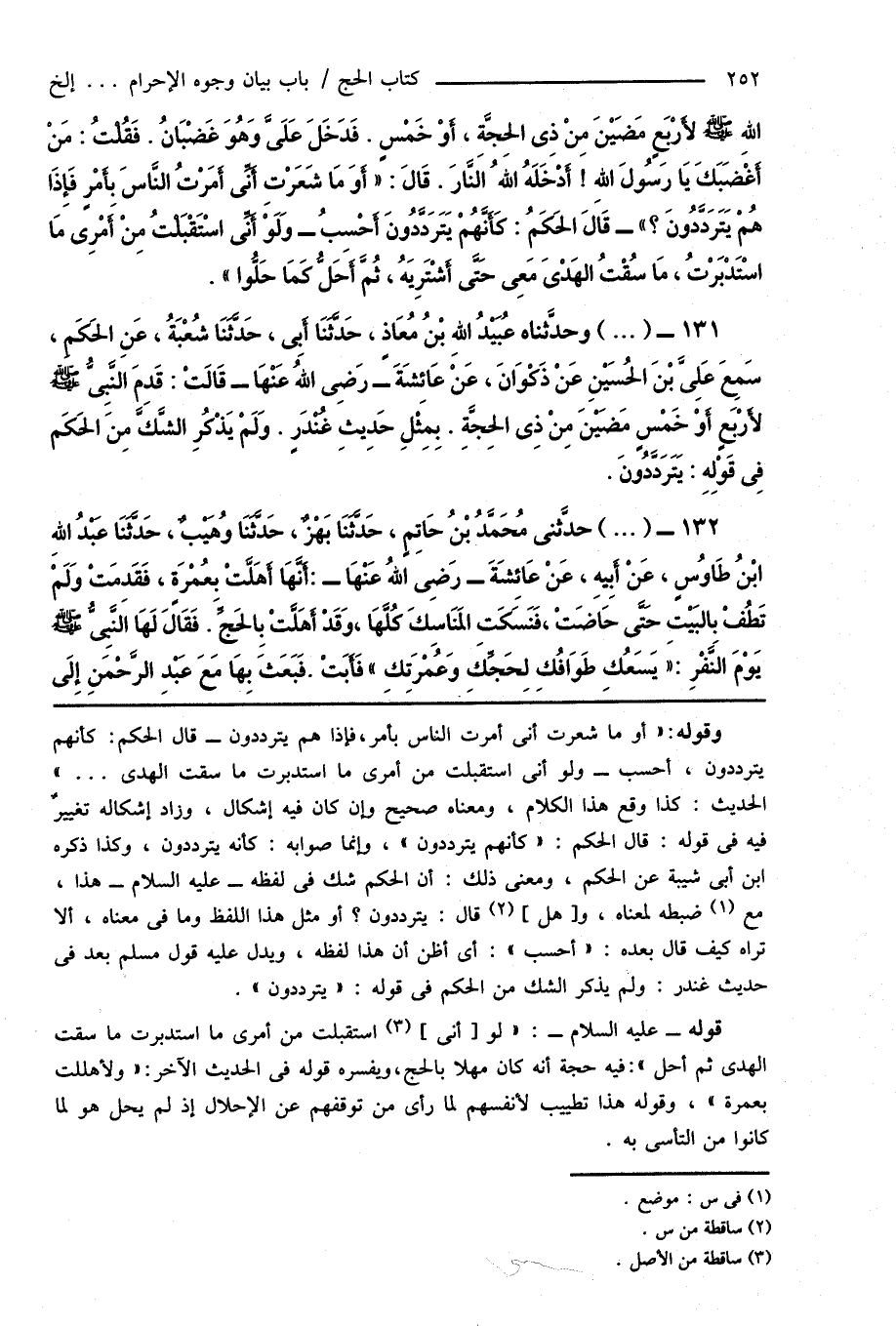 وقوله: " أو ما شعرت أنى أمرت الناس بأمر، فإذا هم يترددون - قال الحكم: كأنهم يترددون، أحسب - ولو أنى استقبلت من أمرى ما استدبرت ما سقت الهدى ... " الحديث: كذا وقع هذا الكلام، ومعناه صحيح وإن كان فيه إشكال، وزاد إشكاله تغييرٌ فيه فى قوله: قال الحكم: " كأنهم يترددون "، وإنما صوابه: كأنه يترددون، وكذا ذكره ابن أبى شيبة عن الحكم، ومعنى ذلك: أن الحكم شك فى لفظه - عليه السلام - هذا، مع (¬1) ضبطه لمعناه، و [هل] (¬2) قال: يترددون؟ أو مثل هذا اللفظ وما فى معناه، ألا تراه كيف قال بعده: " أحسب ": أى أظن أن هذا لفظه، ويدل عليه قول مسلم بعد فى حديث غندر: ولم يذكر الشك من الحكم فى قوله: " يترددون ".