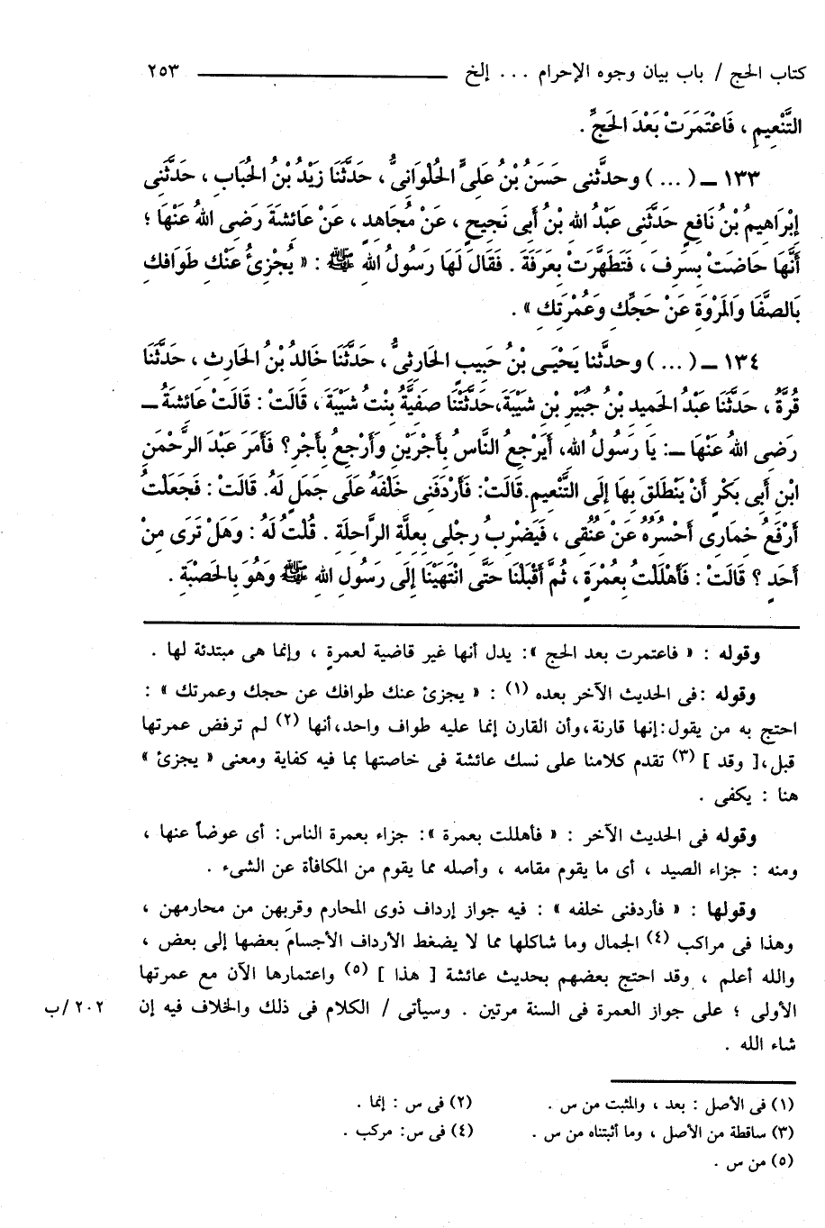 134 - (...) وحدَّثنا يَحْيَى بْنُ حَبِيبٍ الحَارِثِىُّ، حَدَّثَنَا خَالِدُ بْنُ الحَارِثِ، حَدَّثَنَا قُرَّةُ، حَدَّثَنَا عَبْدُ الحَمِيدِ بْنُ جُبَيْرِ بْنِ شَيْبَةَ، حَدَّثَتْنَا صَفِيَّةُ بِنْتُ شَيْبَةَ، قَالَتْ: قَالَتْ عَائِشَةُ - رَضِىَ اللهُ عَنْهَا -: يَا رَسُولُ اللهِ، أَيَرْجِعُ النَّاسُ بِأَجْرَيْنِ وَأَرْجِعُ بِأَجْرٍ؟ فَأَمَرَ عَبْدَ الرَّحْمَنِ ابْنِ أَبِى بَكْرٍ أَنْ يَنْطَلِقَ بِهَا إِلَى التَّنْعِيمِ. قَالَتْ: فَأَرْدَفَنِى خَلْفَهُ عَلَى جَمَلٍ لَهُ. قَالَتْ: فَجَعَلْتُ أَرْفَعُ خِمَارِى أَحْسُرُهُ عَنْ عُنُقِى، فَيَضْرِبُ رِجْلِى بِعِلَّةِ الرَّاحِلَةِ. قُلْتُ لَهُ: وَهَلْ تَرَى مِنْ أَحَدٍ؟ قَالَتْ: فَأَهْلَلْتُ بِعُمْرَةٍ، ثُمَّ أَقْبَلْنَا حَتَّى انْتَهَيْنَا إِلَى رَسُولِ اللهِ صَلَّى اللهُ عَلَيْهِ وَسَلَّمَ وَهُوَ بِالحَصْبَةِ.