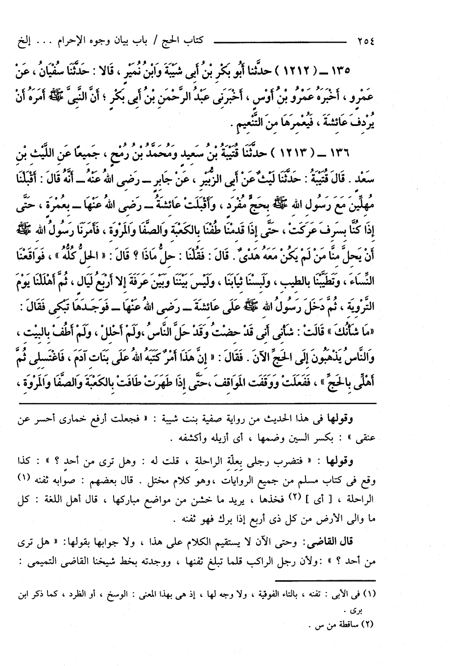 136 - (1213) حَدَّثَنَا قُتَيْبَةُ بْنُ سَعِيدٍ وَمُحَمَّدُ بْنُ رُمْحٍ، جَمِيعًا عَنِ اللَّيْثِ بْنِ سَعْدٍ. قَالَ قُتَيْبَةُ: حَدَّثَنَا لَيْثٌ عَنْ أَبِى الزُّبَيْرِ، عَنْ جَابِرٍ - رَضِىَ اللهُ عَنْهُ - أَنَّهُ قَالَ: أَقْبَلْنَا مُهِلِّينَ مَعَ رَسُولِ اللهِ صَلَّى اللهُ عَلَيْهِ وَسَلَّمَ بِحَجٍّ مُفْرَدٍ، وَأَقْبَلَتْ عَائِشَةُ - رَضِىَ اللهُ عَنْهَا - بِعُمْرَةٍ، حَتَّى إِذَا كُنَّا بِسَرِفَ عَرَكَتْ، حَتَّى إِذَا قَدِمْنَا طُفْنَا بِالكَعْبَةِ وَالصَّفَا وَالمَرْوَةِ، فَأَمَرَنَا رَسُولُ اللهِ صَلَّى اللهُ عَلَيْهِ وَسَلَّمَ أَنْ يَحِلَّ مِنَّا مَنْ لَمْ يَكُنْ مَعَهُ هَدْىٌ. قَالَ: فَقُلْنَا: حِلُّ مَاذَا؟ قَالَ: " الحِلُّ كُلُّهُ "، فَوَاقَعْنَا النِّسَاءَ، وَتَطَيَّبْنَا بالطِيبِ، وَلَبِسْنَا ثِيَابَنَا، وَلَيْسَ بَيْنَنَا وَبَيْنَ عَرَفَةَ إِلا أَرْبَعُ لَيَالٍ، ثُمَّ أَهْلَلْنَا يَوْمَ التَّرْوِيَةِ، ثُمَّ دَخَلَ رَسُولُ اللهِ صَلَّى اللهُ عَلَيْهِ وَسَلَّمَ عَلَى عَائِشَةَ - رَضِىَ اللهُ عَنْهَا - فَوَجَدَهَا تَبْكِى فَقَالَ: " مَا شَأَنُكَ " قَالَتْ: شَأْنِى أَنِّى قَدْ حِضْتُ وَقَدْ حَلَّ النَّاسُ، وَلَمْ أَحْلِلْ، وَلَمْ أَطُفْ بِالبَيْتِ، وَالنَّاسُ يَذْهَبُونَ إِلَى الحَجِّ الآنَ. فَقَالَ: " إِنَّ هَذَا أَمْرٌ كَتَبَهُ اللهُ عَلَى بَنَاتِ آدَمَ، فَاغْتَسِلِى ثُمَّ أَهْلِّى بِالحَجِّ "، فَفَعَلَتْ وَوَقَفَت المَوَاقِفَ، حَتَّى إِذَا طَهَرَتْ طَافَتْ بِالكَعْبَة وَالصَّفَا وَالمَرْوَةِ،