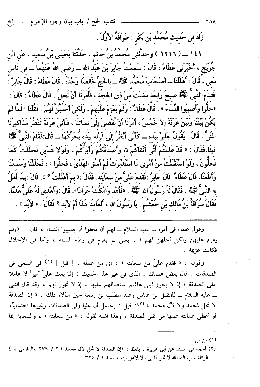 141 - (1216) وحدَّثنى مُحَمَّدُ بْنُ حَاتِمٍ، حَدَّثَنَا يَحْيَى بْنُ سَعِيدٍ، عَنِ ابْنِ جُرَيْجٍ، أَخْبَرَنِى عَطَاءٌ، قَالَ: سَمِعْتُ جَابِرَ بْنَ عَبْدِ اللهِ - رَضِىَ اللهُ عَنْهُمَا - فِى نَاسٍ مَعِىَ، قَالَ: أَهْلَلْنَا - أَصْحَابَ مُحَمَّدٍ صَلَّى اللهُ عَلَيْهِ وَسَلَّمَ - بِالحَجِّ خَالِصًا وَحْدَهُ. قَالَ عَطَاءٌ: قَالَ جَابِرٌ: فَقِدَمَ النَّبِىُّ صَلَّى اللهُ عَلَيْهِ وَسَلَّمَ صِبحَ رَابِعَةٍ مَضَتْ مِنْ ذِى الحِجَّةِ، فَأَمَرَنَا أَنْ نَحِلَّ. قَالَ عَطَاءٌ: قَالَ: "حِلُّوا وَأَصِيبُوا النِّسَاءَ ". قَالَ عَطَاءٌ: وَلَمْ يَعْزِمْ عَلَيْهِمْ، وَلَكِنْ أَحَلَّهُنَّ لَهُمْ. فَقُلْنَا: لَمَّا لَمْ يَكُنْ بَيْنَنَا وَبَيْنَ عَرَفَةَ إِلا خَمْسٌ، أَمَرَنَا أَنْ نُفْضِىَ إِلَى نِسَائِنَا، فَنَأْتِىَ عَرَفَةَ تَقْطُرُ مَذَاكِيرُنَا المَنى. قَالَ: يَقُولُ جَابِرٌ بِيَدِهِ - كَأَنِّى أَنْظُرُ إِلَى قَوْلِهِ بِيَدِهِ يُحَرِّكُّهَا - قَال: فَقَامَ النَّبِىُّ صَلَّى اللهُ عَلَيْهِ وَسَلَّمَ فِينَا. فَقَالَ: " قَدْ عَلِمْتُمْ أَنِّى أَتْقَاكُمْ للهِ وَأَصْدَقُكُمْ وَأَبَرُّكُمْ، وَلَوْلا هَدْيِى لَحَلَلْتُ كَمَا تَحِلُّونَ، وَلَوْ اسْتَقْبَلْتُ مِنْ أَمْرِى مَا اسْتَدْبَرْتُ لَمْ أَسُقِ الهَدْىَ، فَحِلُّوا "، فَحَلَلْنَا وَسَمِعْنَا وَأَطَعْنَا. قَالَ عَطَاءٌ: قَالَ جَابِرٌ: فَقَدِمَ عَلِىٌّ مِنْ سِعَايَتِهِ. فَقَالَ: " بِمَ أَهْلَلْتُ؟ ". قَالَ: بِمَا أَهَلَّ بِهِ النَّبِىُّ صَلَّى اللهُ عَلَيْهِ وَسَلَّمَ. فَقَالَ لَهُ رَسُولُ اللهِ صَلَّى اللهُ عَلَيْهِ وَسَلَّمَ: " فَأَهْدِ وَامْكُثْ حَرَامًا ". قَالَ: وَأَهْدى لَهُ عَلِىٌّ هَدْيًا. فَقَالَ سُرَاقَةُ بْنُ مَالِكِ بْنِ جُعْشُمٍ: يَا رَسُولَ اللهِ، أَلِعَامِنَا هَذَا أَمْ لأَبَدٍ؟ فَقَالَ: " لأَبَدٍ ".