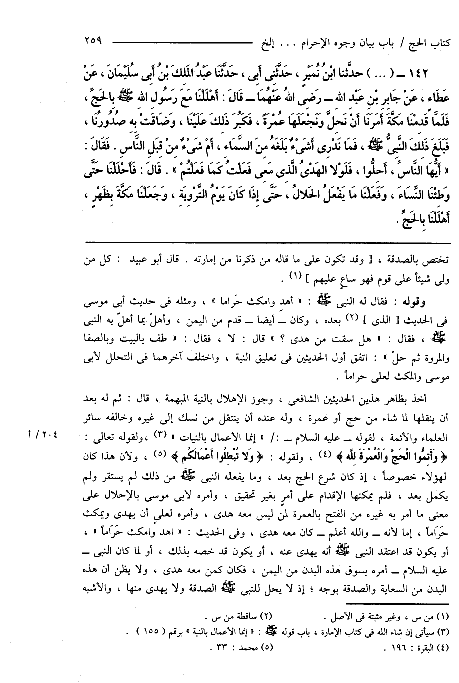 142 - (...) حدَّثنا ابْنُ نُمَيْرٍ، حَدَّثَنِى أَبِى، حَدَّثَنَا عَبْدُ المَلِكَ بْنُ أَبِى سُلَيْمَانَ، عَنْ عَطَاءٍ، عَنْ جَابِرِ بْنِ عَبْدِ اللهِ - رَضِىَ اللهُ عَنْهُمَا - قَالَ: أَهْلَلْنَا مَعَ رَسُولِ اللهِ صَلَّى اللهُ عَلَيْهِ وَسَلَّمَ بِالحَجِّ، فَلَمَّا قَدِمْنَا مَكَّةَ أَمَرَنَا أَنْ نَحِلَّ وَنَجْعَلَهَا عُمْرَةً، فَكَبُرَ ذَلِكَ عَلَيْنَا، وَضَاقَتْ بهِ صُدُورُنَا، فَبَلَغَ ذَلِكَ النَّبِىُّ صَلَّى اللهُ عَلَيْهِ وَسَلَّمَ، فَمَا نَدْرِى أَشَىْءٌ بَلَغَهُ مِنَ السَّمَاءِ، أَمْ شَىْءٌ مِنْ قِبَلِ النَّاسِ. فَقَالَ: " أَيُّهَا النَّاسُ، أَحِلُّوا، فَلَوْلا الهَدْىُ الَّذِى مَعِى فَعَلْتُ كَمَا فَعَلْتُمْ ". قَالَ: فَأَحْلَلْنَا حَتَّى وَطِئْنَا النِّسَاءَ، وَفَعَلْنَا مَا يَفْعَلُ الحَلالُ، حَتَّى إِذَا كَانَ يَوْمُ التَّرْوِيَةِ، وَجَعَلْنَا مَكَّةَ بِظَهْرٍ، أَهْلَلْنَا بِالحَجِّ.