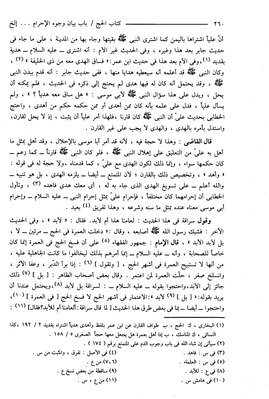 وقول سراقة فى هذا الحديث: لعامنا هذا أم لأبد. فقال: " لأبد "، وفى الحديث الآخر: فشبك رسول الله صَلَّى اللهُ عَلَيْهِ وَسَلَّمَ أصابعه، وقال: " دخلت العمرة فى الحج - مرتين - لا، بل لأبد الأبد "، قال الإمام: جمهور الفقهاء (¬5) على أن فسخ الحج فى العمرة إنما كان خاصاً للصحابة، وأنه - عليه السلام - إنما أمرهم بذلك ليخالفوا ما كانت الجاهلية عليه، من أنها لا تستبيح العمرة فى أشهر الحج، [وتقول] (¬6): إذا برأ الدّبر، وعفا الأثر، وانسلخ صفر، حلَّت العمرة لمن اعتمر. وقال بعض أصحاب الظاهر: [بل] (¬7) ذلك جائز إلى الأبد، واحتجوا بقوله - عليه السلام -: لسراقة بل لأبد (¬8)، ويحتمل عندنا أن يريد بقوله: " [بل] (¬9) لأبد ": الاعتمار فى أشهر الحج لا فسخ الحج [فى العمرة] (¬10)، واحتجوا - أيضاً - بما فى بعض طرق هذا الحديث [لما قال سراقة: ألعامنا أم للأبد؟ فقال] (¬11):