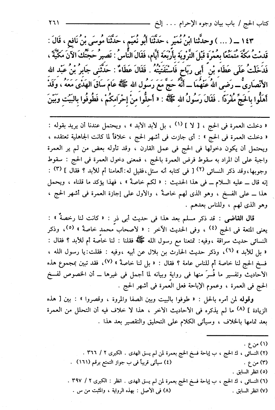 143 - (...) وحدَّثنا ابْنُ نُمَيْرٍ، حَدَّثَنَا أَبُو نُعَيْمٍ، حَدَّثَنَا مُوسَى بْنُ نَافِعٍ، قَالَ: قَدِمْتُ مَكَّةَ مُتَمتِّعًا بِعُمْرَةٍ قَبْلَ التَّرْوِيَةِ بِأَرْبَعَةِ أَيَّامٍ، فَقَالَ النَّاسُ: تَصِيرُ حَجَّتُكَ الآنَ مَكِّيَّةً، فَدَخَلْتُ عَلَى عَطَاءِ بْنِ أَبِى رَبَاحٍ فَاسْتَفَتيْتُهُ. فَقَالَ عَطَاءٌ: حَدَّثَنِى جَابِرُ بْنُ عَبْدِ اللهِ الأَنْصَارِىُّ - رَضِىَ اللهُ عَنْهُمَا - أَنَّهُ حَجَّ مَعَ رَسُولِ اللهِ صَلَّى اللهُ عَلَيْهِ وَسَلَّمَ عَامَ سَاقَ الهَدْىَ مَعَهُ، وَقَدْ أَهَلُّوا بِالحَجِّ مُفْرَدًا. فَقَالَ رَسُولُ اللهِ صَلَّى اللهُ عَلَيْهِ وَسَلَّمَ: " أَحِلُّوا مِنْ إِحْرَامِكُمْ، فَطُوفُوا بِالبَيْتِ وَبَيْنَ