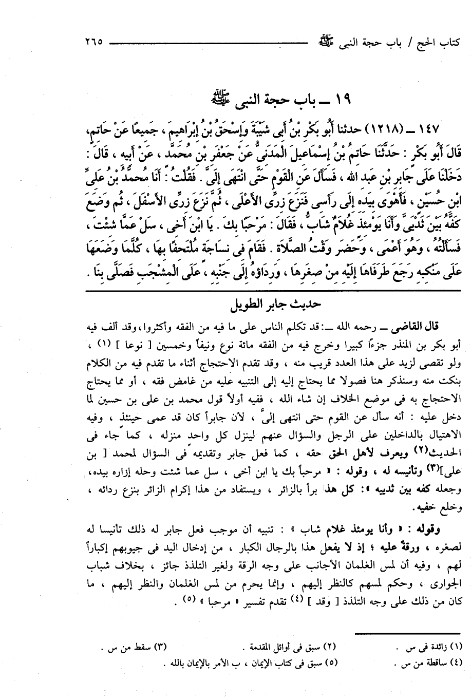 قال القاضى - رحمه الله -: قد تكلم الناس على ما فيه من الفقه وأكثروا، وقد ألف فيه أبو بكر بن المنذر جزءًا كبيراً وخرج فيه من الفقه مائة نوع ونيفاً وخمسين [نوعاً] (¬1)، ولو تقصى لزيد على هذا العدد قريب منه، وقد تقدم الاحتجاج أثناء ما تقدم فيه من الكلام بنكت منه وسنذكر هنا فصولاً مما يحتاج إليه إلى التنبيه عليه من غامض فقه، أو مما يحتاج الاحتجاج به فى موضع الخلاف إن شاء الله، ففيه أولاً قول محمد بن على بن حسين لما دخل عليه: أنه سأل عن القوم حتى انتهى إلىَّ، لأن جابراً كان قد عمى حينئذٍ، وفيه الاهتيال بالداخلين على الرجل والسؤال عنهم لينزل كل واحدٍ منزله، كما جاء فى الحديث (¬2) ويعرف لأهل الحق حقه، كما فعل جابر وتقديمه فى السؤال لمحمد [بن على] (¬3) وتأنيسه له، وقوله: " مرحباً بك يا ابن أخى، سل عما شئت وحله إزاره بيده، وجعله كفه بين ثدييه ": كل هذ برأ بالزائر، ويستفاد من هذا إكرام الزائر بنزع ردائه، وخلع خفيه.