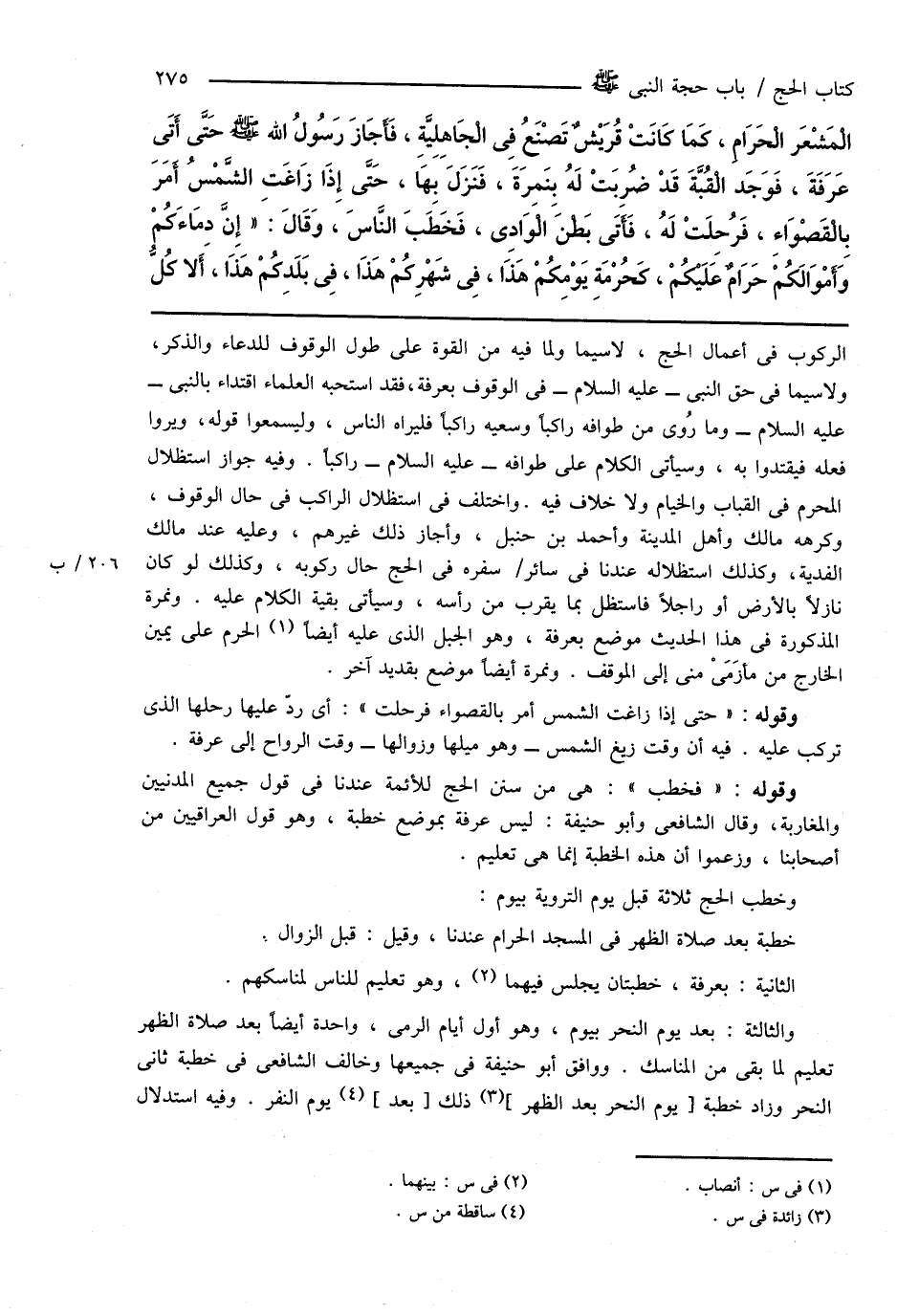 الْمَشْعَرِ الْحَرَامِ، كَمَا كَانَتْ قُرَيْشٌ تَصْنَعُ فِى الْجَاهِلِيَّةِ، فَأَجَازَ رَسُولُ اللهِ صَلَّى اللهُ عَلَيْهِ وَسَلَّمَ حَتَّى أَتَى عَرَفَةَ، فَوَجَدَ الْقُبَّةَ قَدْ ضُرِبَتْ لَهُ بنَمِرَةَ، فَنَزَلَ بِهَا، حَتَّى إِذَا زَاغَتِ الشَّمْسُ أَمَرَ بِالْقَصْوَاءِ، فَرُحِلَتْ لَهُ، فَأَتَى بَطْنَ الْوَادِى، فَخَطَبَ النَّاسَ، وَقَالَ: " إِنَّ دِمَاءَكُمْ وَأَمْوَالَكُمْ حَرَامٌ عَلَيْكمْ، كَحُرْمَةِ يَوْمِكُمْ هَذَا، فِى شَهْرِكُمْ هَذَا، فِى بَلَدِكُمْ هَذَا، أَلا كُلُّ