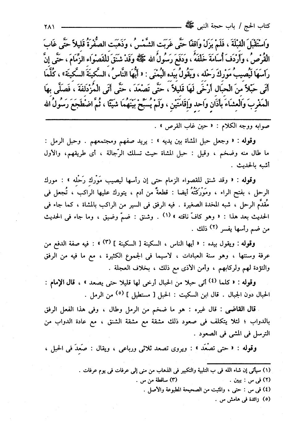 وقوله: " وقد شنق للقصواء الزمام حتى إن رأسها ليصيب مَوْركِ رَحْلِه ": مورك الرحل، بفتح الراء، ومَوْرَكَتُهُ أيضاً: قطعةٌ من أدم، يتورك عليها الرَاكب، تُجعل فى مُقدَّم الرحل، شبه المخدة الصغيرة. فيه الرفق فى السير من الراكب بالمشاة، كما جاء فى الحديث بعد هذا: " وهو كافّ ناقته " (¬1). وشنق: ضمّ وضيق، وما جاء فى الحديث من ضم رأسها يفسر (¬2) ذلك.