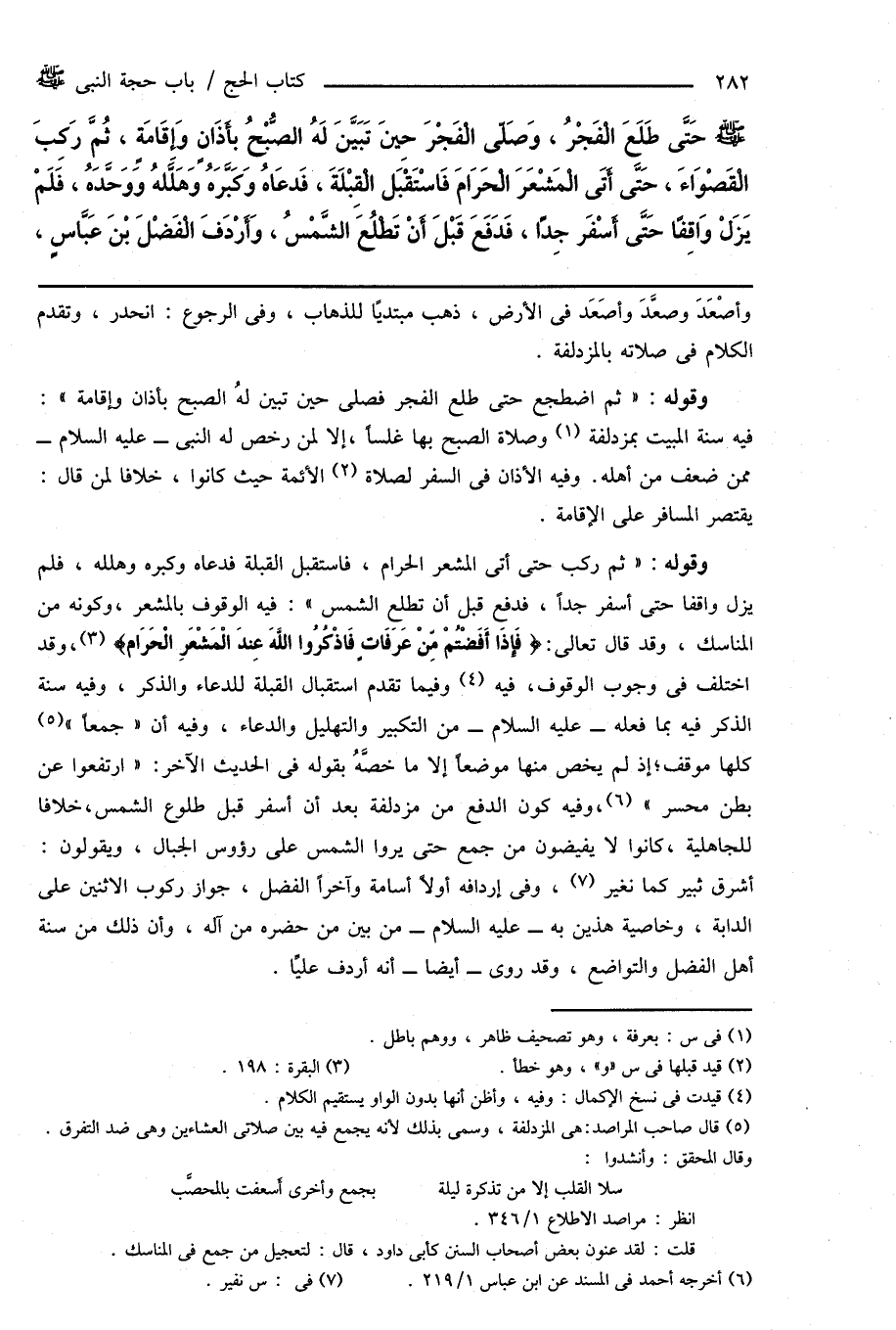 صَلَّى اللهُ عَلَيْهِ وَسَلَّمَ حَتَّى طَلَعَ الْفَجْرُ، وَصَلّى الفَجْرَ حِينَ تَبَيَّنَ لَهُ الصُّبْحُ بِأَذَانٍ وَإِقَامَةٍ، ثُمَّ رَكِبَ الْقَصْوَاءَ، حَتَّى أَتَى الْمَشْعَرَ الحَرَامَ فَاسْتَقبَل الْقِبْلَةَ، فَدعَاهُ وَكَبَّرَهُ وَهَلَّلَهُ وَوَحَّدَهُ، فَلَمْ يَزَلْ وَاقِفًا حَتَّى أَسْفَر جِدًا، فَدَفَعَ قَبْلَ أَنْ تَطْلُعَ الشَّمْسُ، وَأَرْدَفَ الْفَضْلَ بْنَ عَبَّاسٍ،