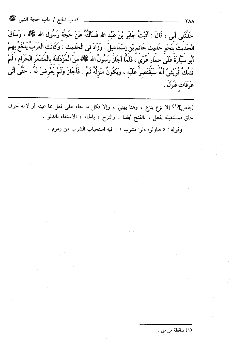 حَدَّثَنِى أَبِى، قَالَ: أَتَيْتُ جَابَر بْنَ عَبْدِ اللهِ فَسَأَلْتُهُ عَنْ حَجَّةِ رَسُولِ اللهِ صَلَّى اللهُ عَلَيْهِ وَسَلَّمَ، وَسَاقَ الْحَدِيثَ بِنَحْوِ حَدِيثِ حَاتِمِ بْنِ إِسْمَاعِيلَ. وَزَادَ فِى الْحَدِيثِ: وَكَانَت الْعَرَبُ يَدْفَعُ بِهِمْ أَبُو سَيَّارَةَ عَلَى حِمَارٍ عُرْىٍ، فَلَمَّا أَجَازَ رَسُولُ اللهِ صَلَّى اللهُ عَلَيْهِ وَسَلَّمَ مِنَ الْمُزْدَلِفَةِ بِالْمَشْعَرِ الْحَرَامِ، لَمْ تَشُكَّ قُرَيْشٌ أَنَّهُ سَيَقْتَصِرُ عَلَيْهِ، وَيَكُونُ مَنْزِلُهُ ثَمَّ. فَأَجَازَ وَلَمْ يَعْرِضْ لَهُ. حَتَّى أَتَى عَرَفَاتٍ فَنَزَلَ.
