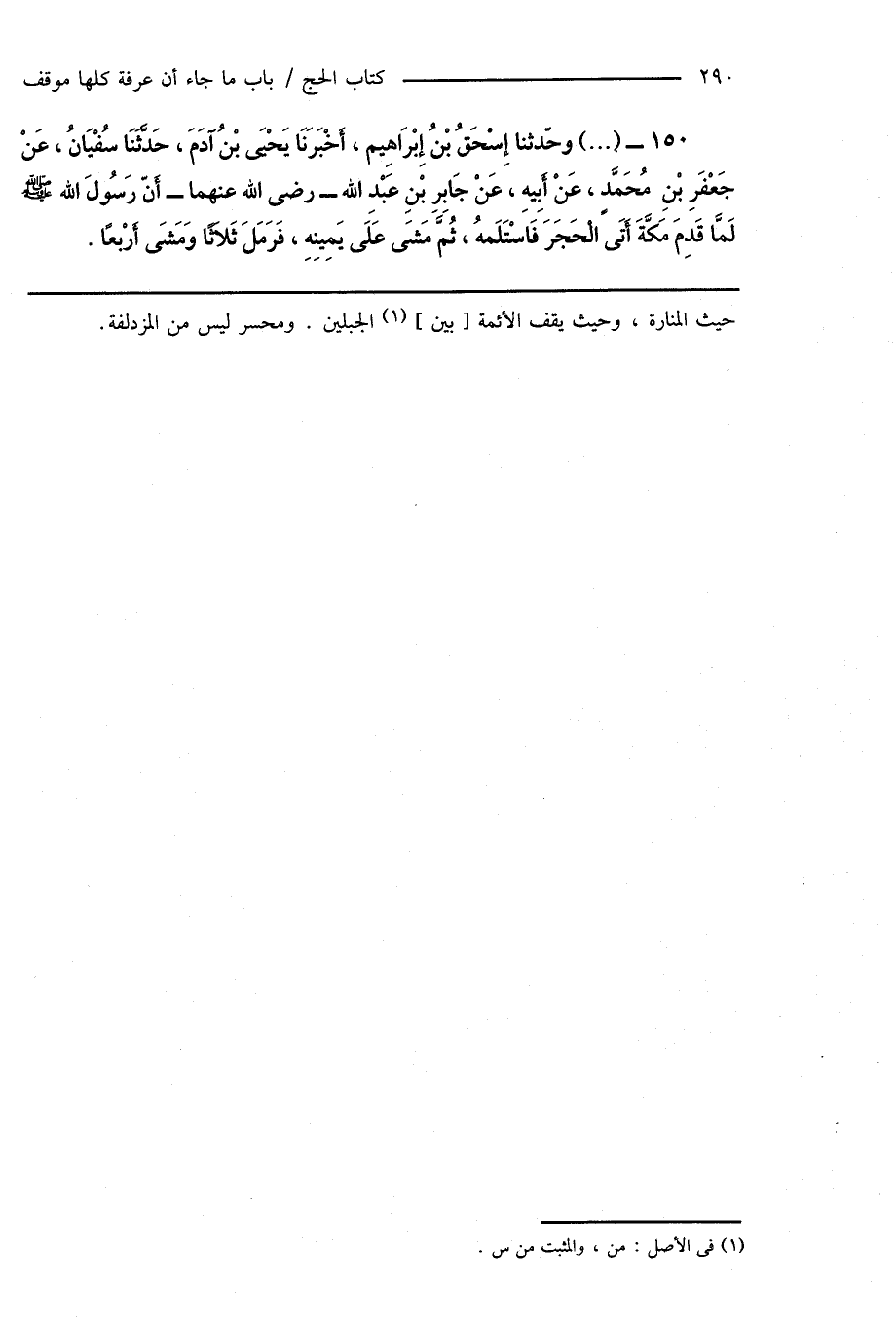150 - (...) وحدّثنا إِسْحَاقُ بْنُ إِبْرَاهِيم، أَخْبَرَنَا يَحْيَى بْنُ آدَمَ، حَدَّثَنَا سُفْيَانُ، عَنْ جَعْفَرِ بْنِ مُحَمَّدٍ، عَنْ أَبِيهِ، عَنْ جَابِرِ بْنِ عَبْدِ اللهِ - رَضِىَ اللهُ عَنْهُمَا - أنّ رَسُولَ اللهِ صَلَّى اللهُ عَلَيْهِ وَسَلَّمَ لَمَّا قَدِمَ مَكَّةَ أَتَى الْحَجَرَ فَاَسْتَلَمهُ، ثُمَّ مَشَى عَلَى يَمِينِهِ، فَرَمَلَ ثَلَاثًا وَمَشَى أَرْبعًا.