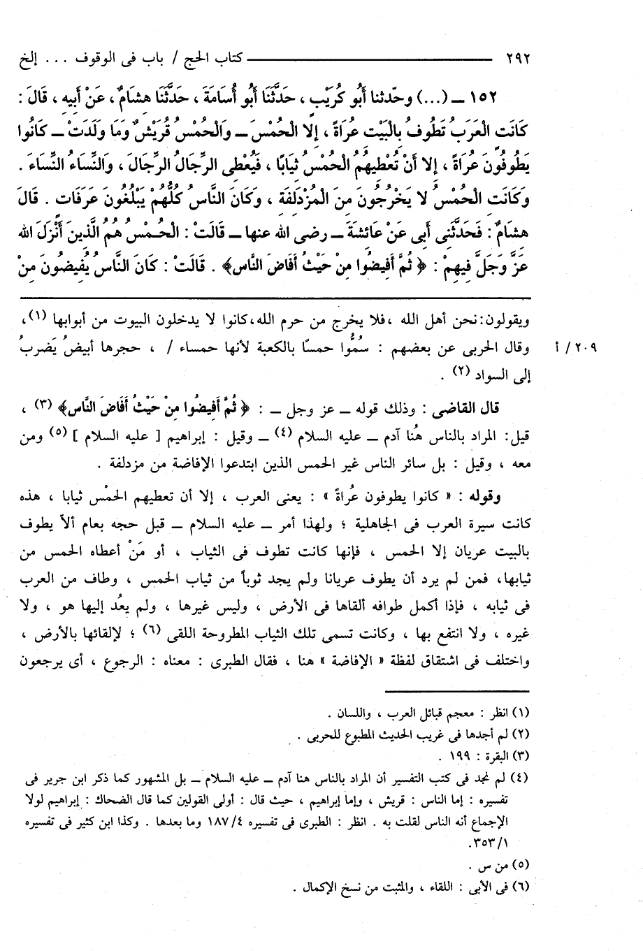 152 - (...) وحدّثنا أَبُو كُرَيْبٍ، حَدَّثَنَا أَبُو أُسَامَةَ، حَدَّثَنَا هِشَامٌ، عَنْ أَبِيهِ، قَالَ: كَانَتِ الْعَرَبُ تَطُوفُ بِالْبَيْتِ عُرَاةً، إِلا الْحُمْسَ - وَالْحُمْسُ قُرَيْشٌ وَمَا وَلَدَتْ - كَانُوا يَطُوفُونَ عُرَاةً، إِلا أَنْ تُعْطِيهُمُ الْحُمْسُ ثِيَابًا، فَيُعْطِى الرِّجَالُ الرِّجَالَ، وَالنِّسَاءُ النِّسَاءَ. وَكَانَتِ الْحُمْسُ لا يَخْرُجُون مِنَ الْمُزْدَلِفَةِ، وَكَانَ النَّاسُ كُلُّهُمْ يَبْلُغُونَ عَرَفَاتٍ. قَالَ هِشَامٌ: فَحَدَّثَنِى أَبِى عَنْ عَائِشَةَ - رَضِىَ اللهُ عَنْهَا - قَالَتْ: الْحُمْسُ هُمُ الَّذِينَ أَنْزَلَ اللهُ عَزَّ وَجَلَّ فِيهِمْ: {ثُمَّ أَفِيضُوا مِنْ حَيْثُ أَفَاضَ النَّاس}. قَالَتْ: كَانَ النَّاسُ يُفِيضُونَ مِنْ